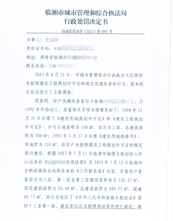對王某未按照建設工程規劃許可證的規定擴建私房的行政處罰