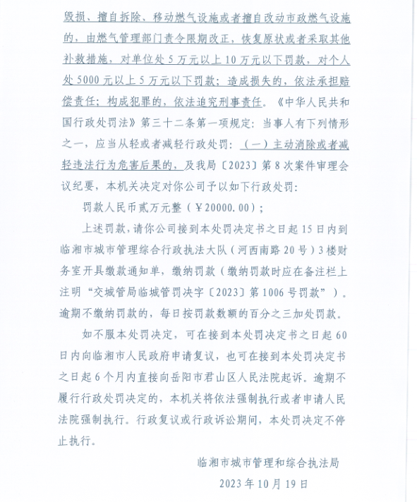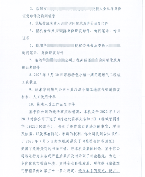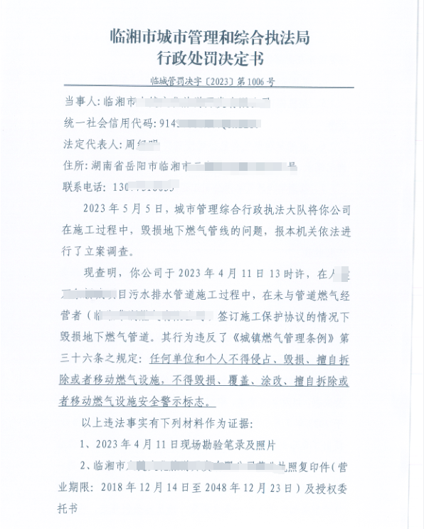 對某公司毀損地下燃氣管線的行政處罰