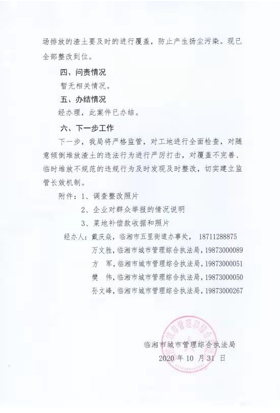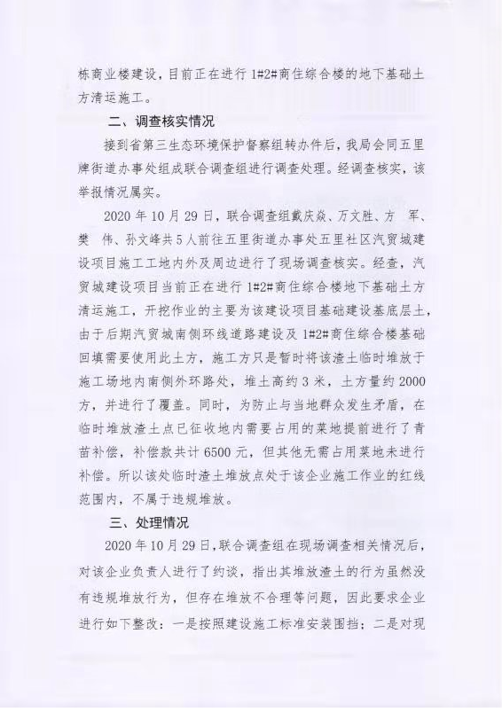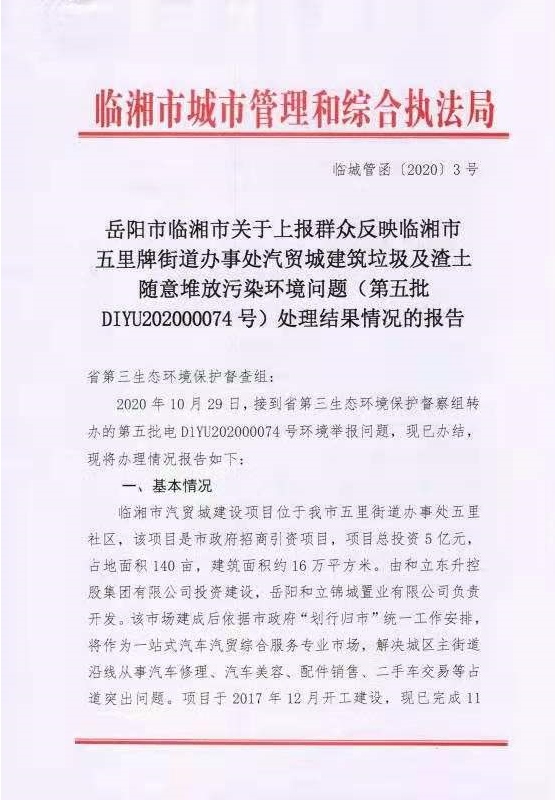 岳陽市臨湘市關于上報群眾反映臨湘市五里牌街道辦事處汽貿城建筑垃圾及渣土隨意堆放污染環境問題(第五批DIYU202000074號)處理結果情況的報告