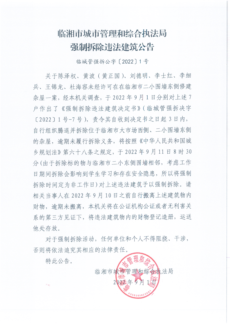 強(qiáng)制拆除違法建筑公告
