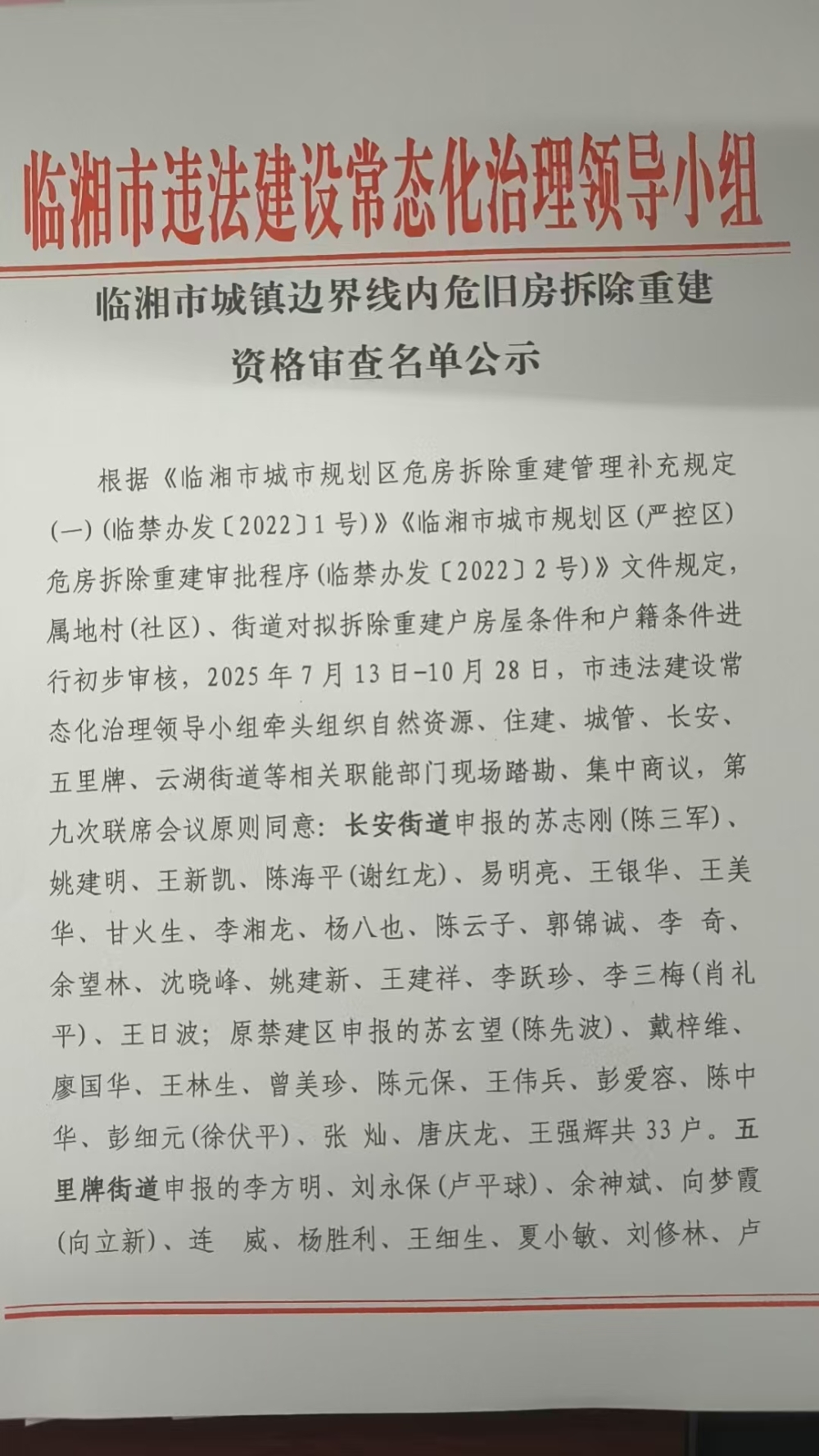 臨湘市城鎮邊界線內危舊房拆除重建資格審查名單公示(第7批)