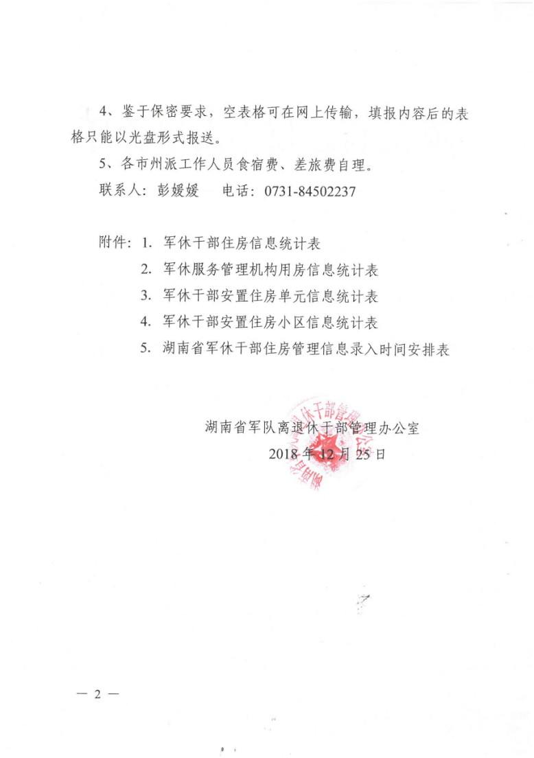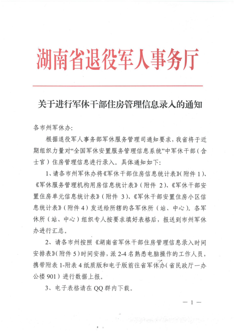 1、請各市州軍休辦將《軍休干部住房信息統計表》(附件1)、《軍休服務管理機構用房信息統計表》(附件2)、《軍休干部安置住房單元信息統計表》(附件3)、《軍休干部安置住房小區信息統計表》(附件4)發送給所轄的各軍休所(站、中心)。各軍休所(站、中心)組織專人按要求填好表格后,報送到市州軍休辦進行匯總。