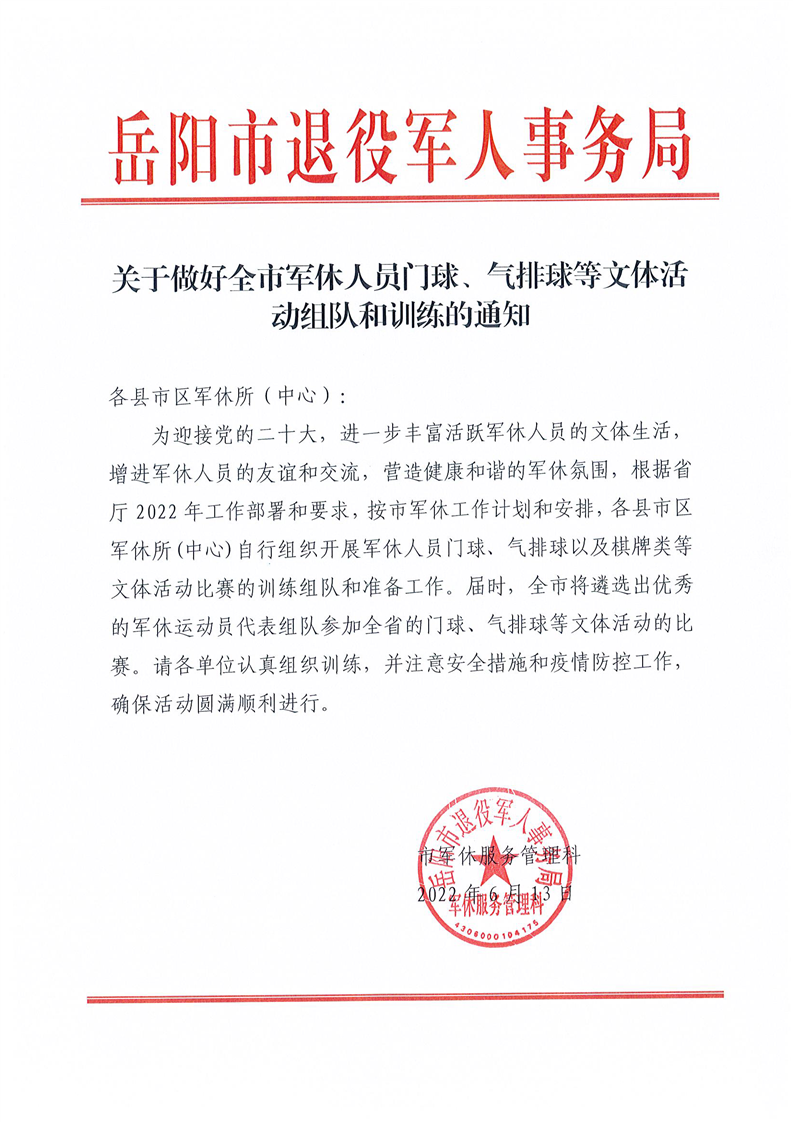 關于做好全市軍休人員門球、氣排球等文體活動組隊和訓練的通知