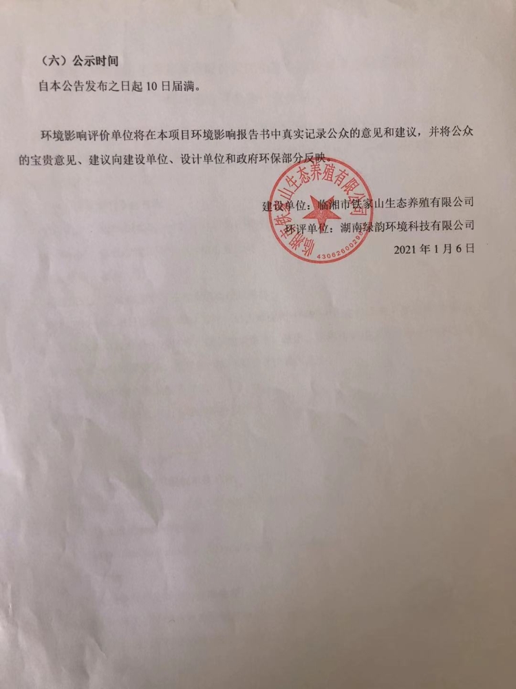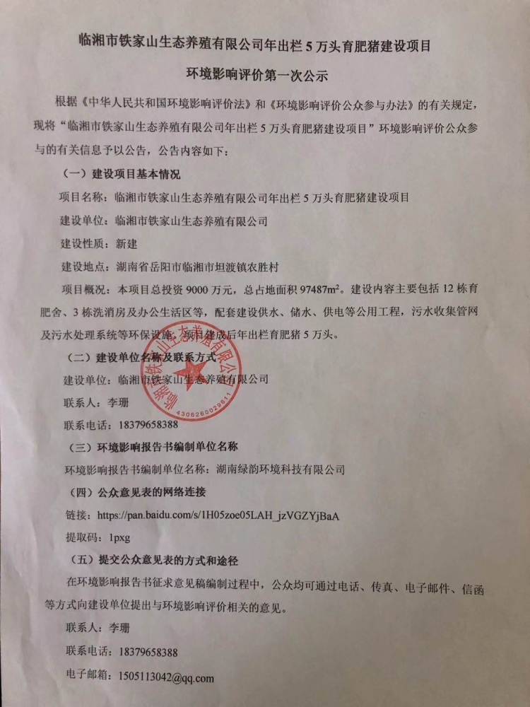 臨湘市鐵家山生態(tài)養(yǎng)殖有限公司出欄5萬頭育肥豬建設(shè)項目環(huán)境影響評價第一次公示