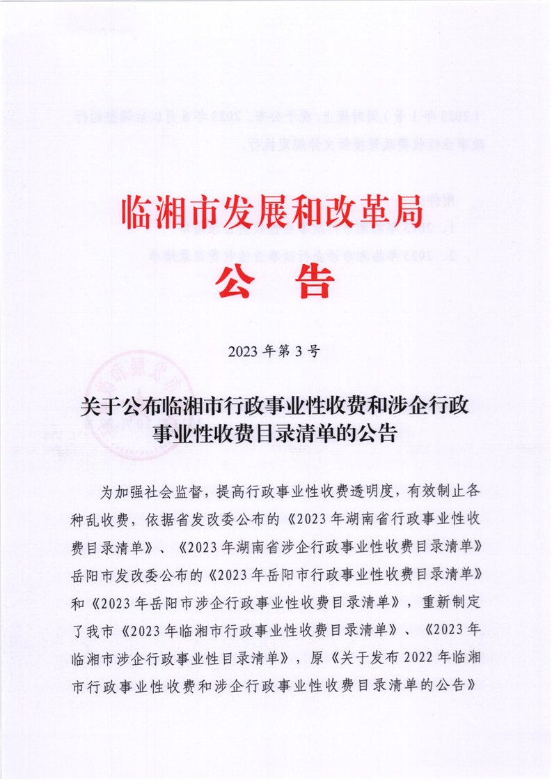 關(guān)于公布臨湘市行政事業(yè)性收費和涉企行政事業(yè)性收費目錄清單的公告