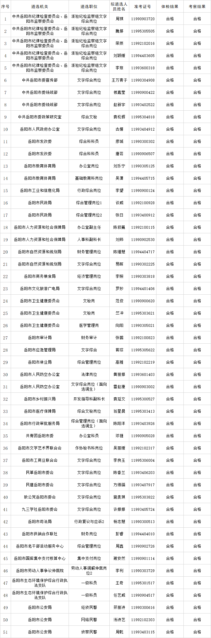 根據(jù)《2022年岳陽市市直機(jī)關(guān)公開遴選公務(wù)員公告》要求,經(jīng)筆試、面試、體檢、考察、遴選機(jī)關(guān)黨委(黨組)集體研究等程序,現(xiàn)確定周祺等51名同志為擬遴選人員,現(xiàn)按要求予以公示: