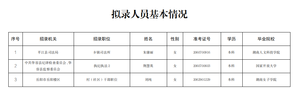 岳陽市2022年考試錄用公務員暫緩錄用考生朱康麗等3名同志擬錄用公示