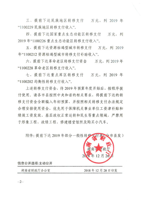 湖南省財政廳關于提前下達2019年部分一般性轉移支付資金的通知