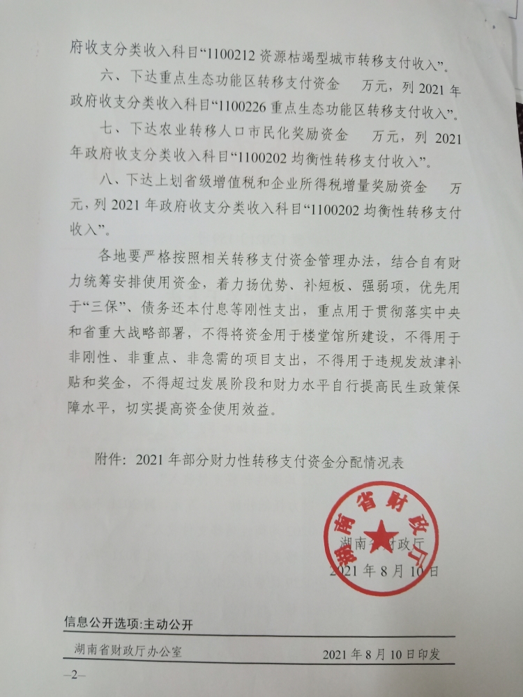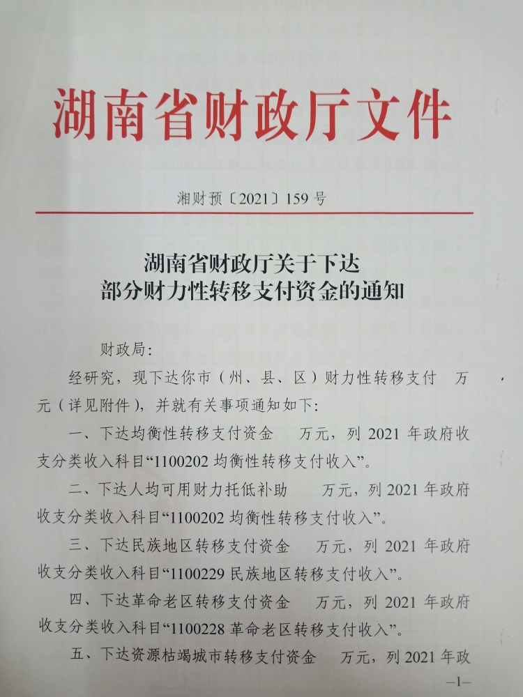 湖南省財政廳關于下達部分財力性轉移支付資金的通知