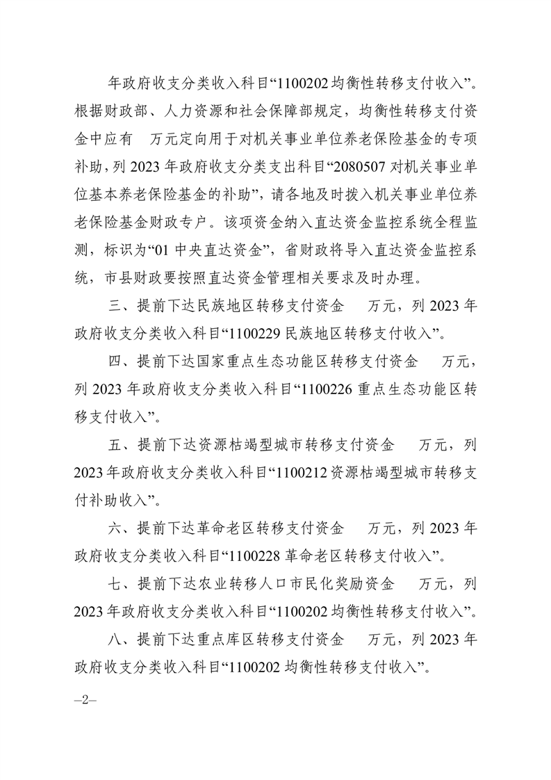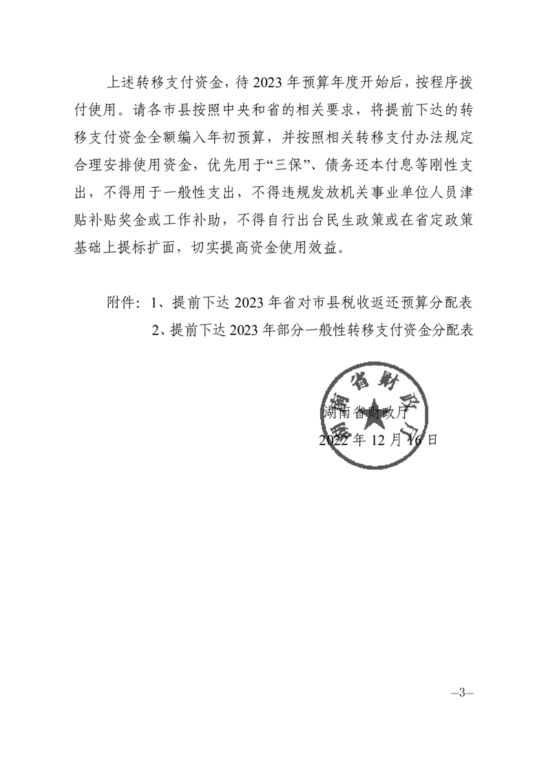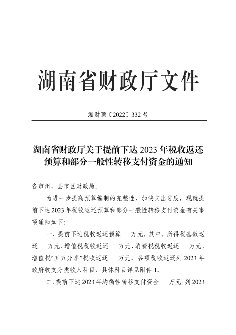 湖南省財政廳關于提前下達2023年稅收返還預算和部分一般性轉移支付資金的通知