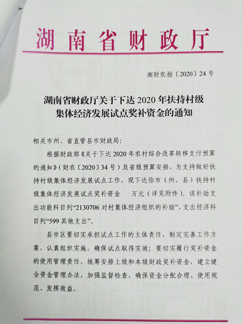 湖南省財(cái)政廳關(guān)于下達(dá)2020年扶持村級集體經(jīng)濟(jì)發(fā)展試點(diǎn)獎(jiǎng)補(bǔ)資金的通知