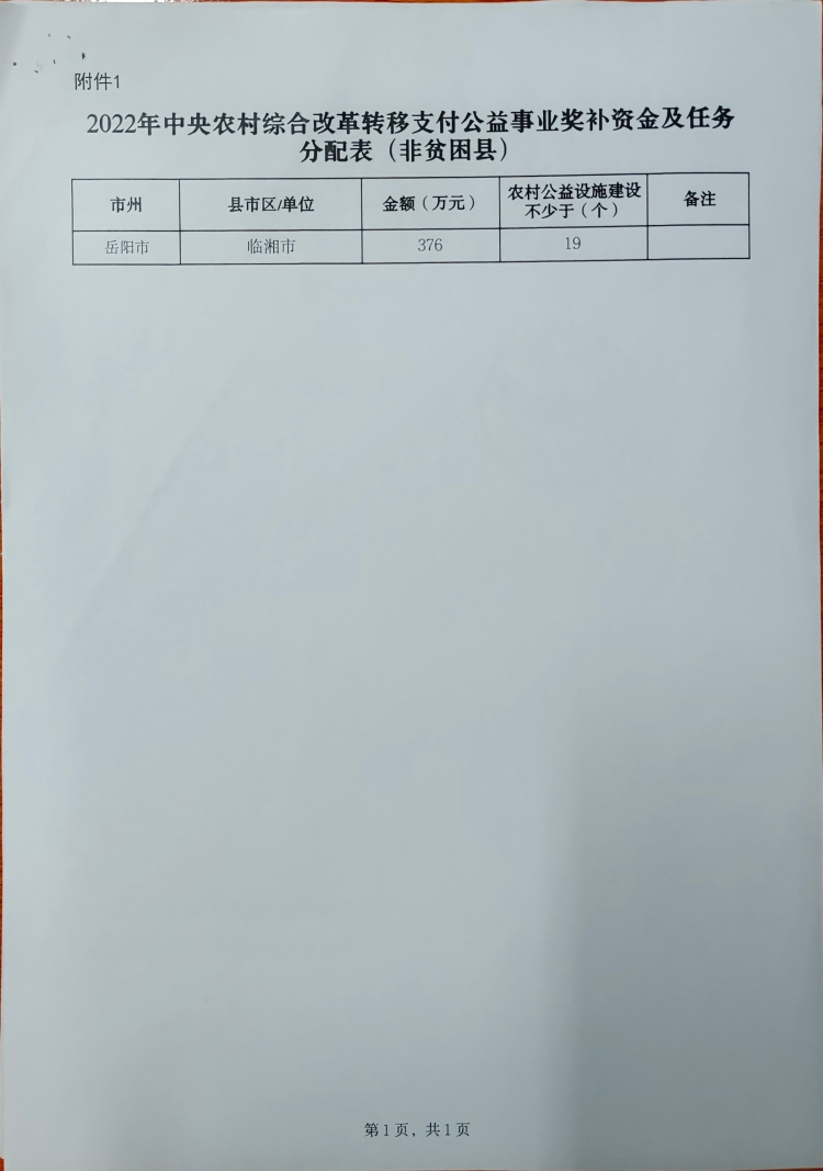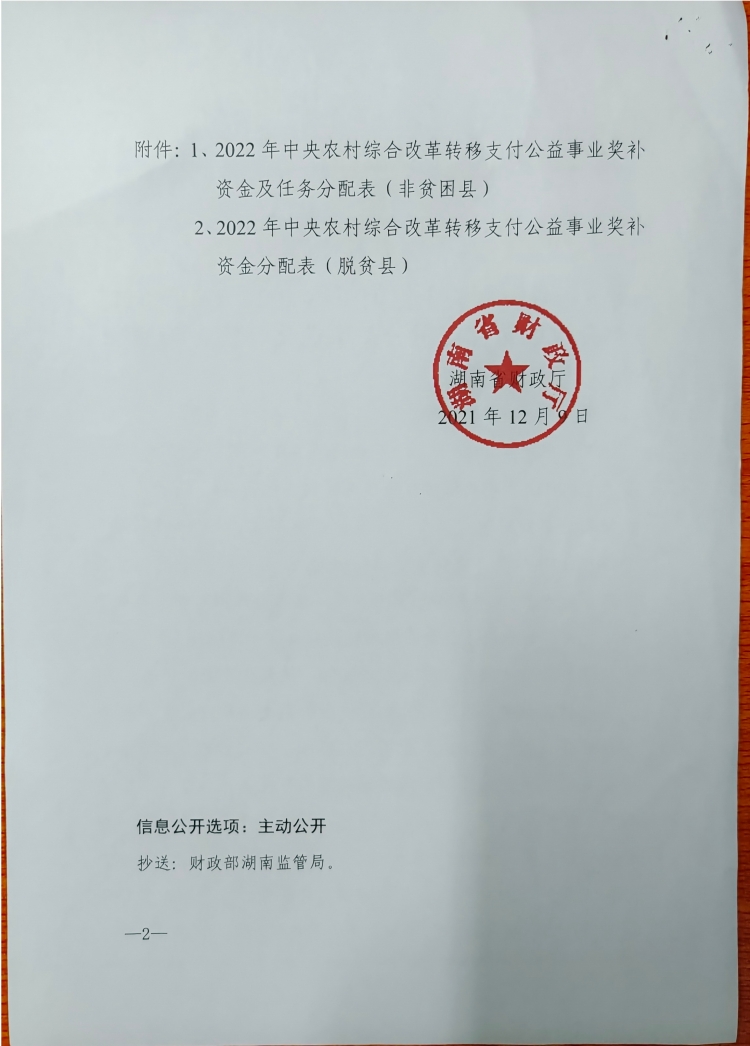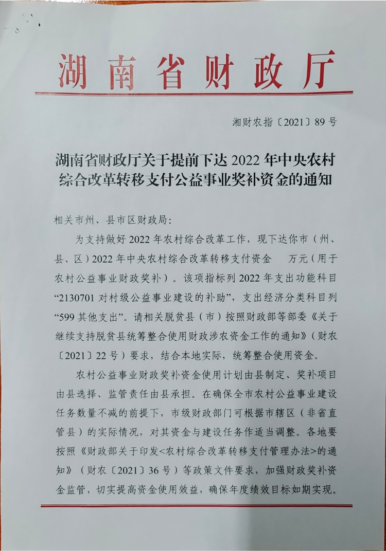 湖南省財政廳關于提前下達2022年中央農村綜合改革轉移支付公益事業獎補資金的通知