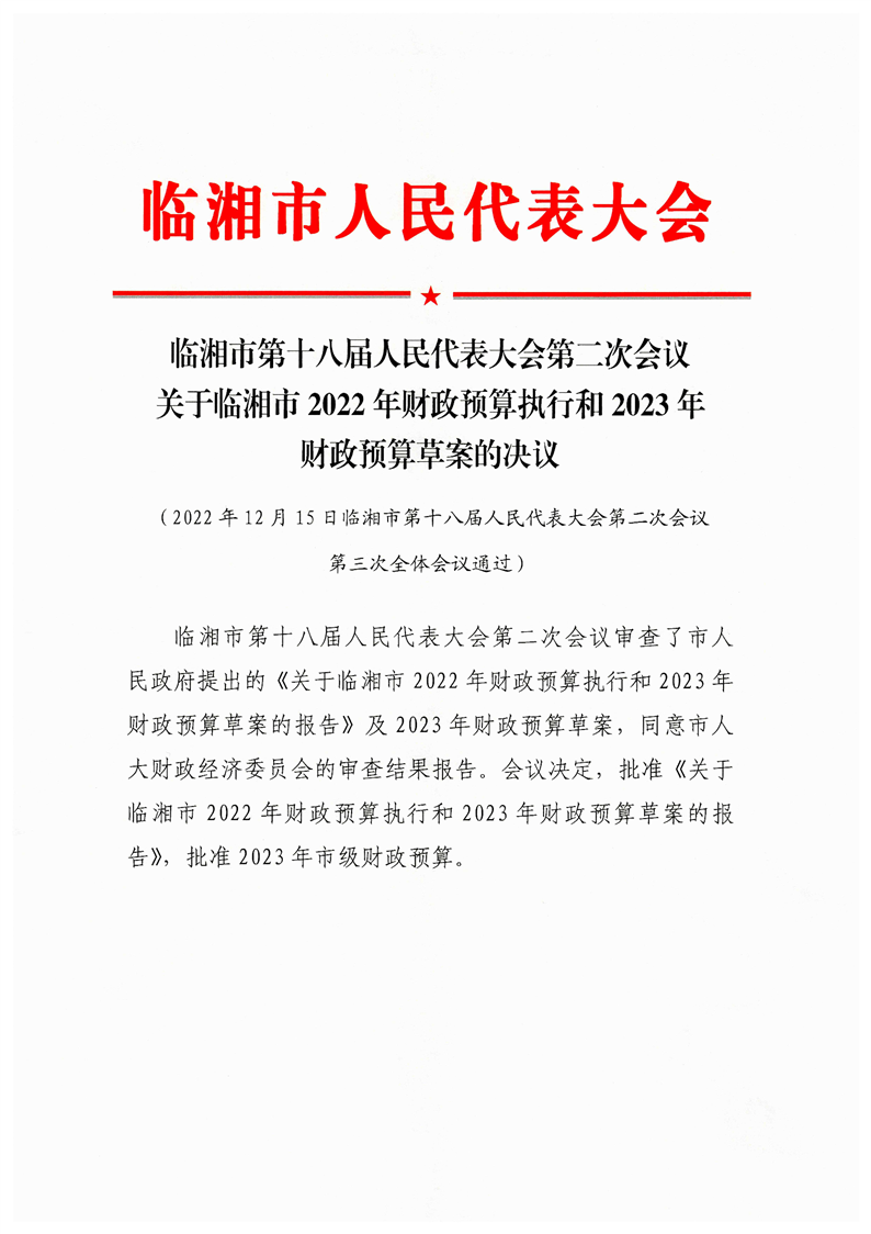 臨湘市第十八屆人民代表大會第二次會議關于臨湘市2022年財政預算執行和2023年財政預算草案的決議