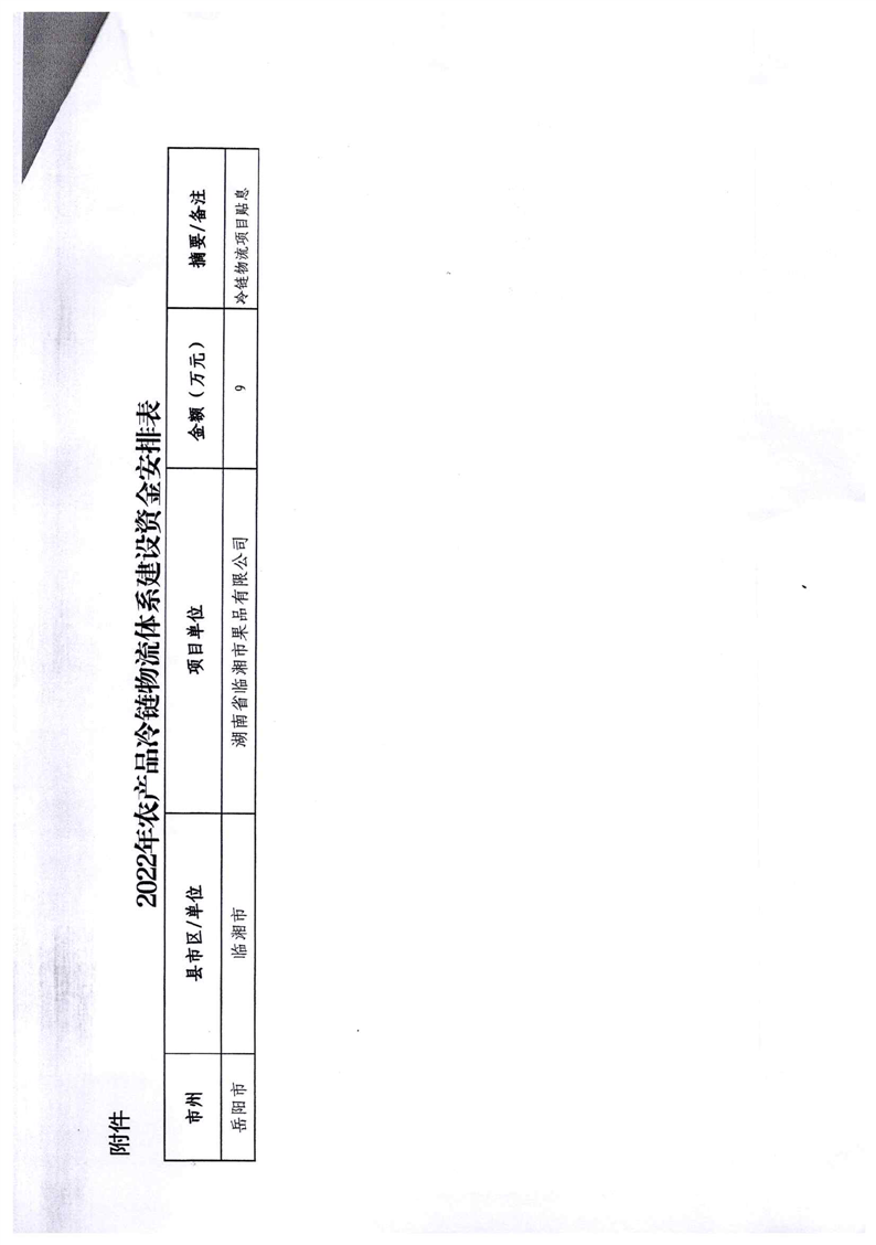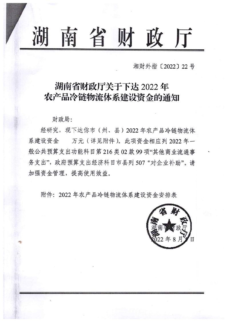 湖南省財政廳關于下達2022年農產品冷鏈物流體系建設資金的通知