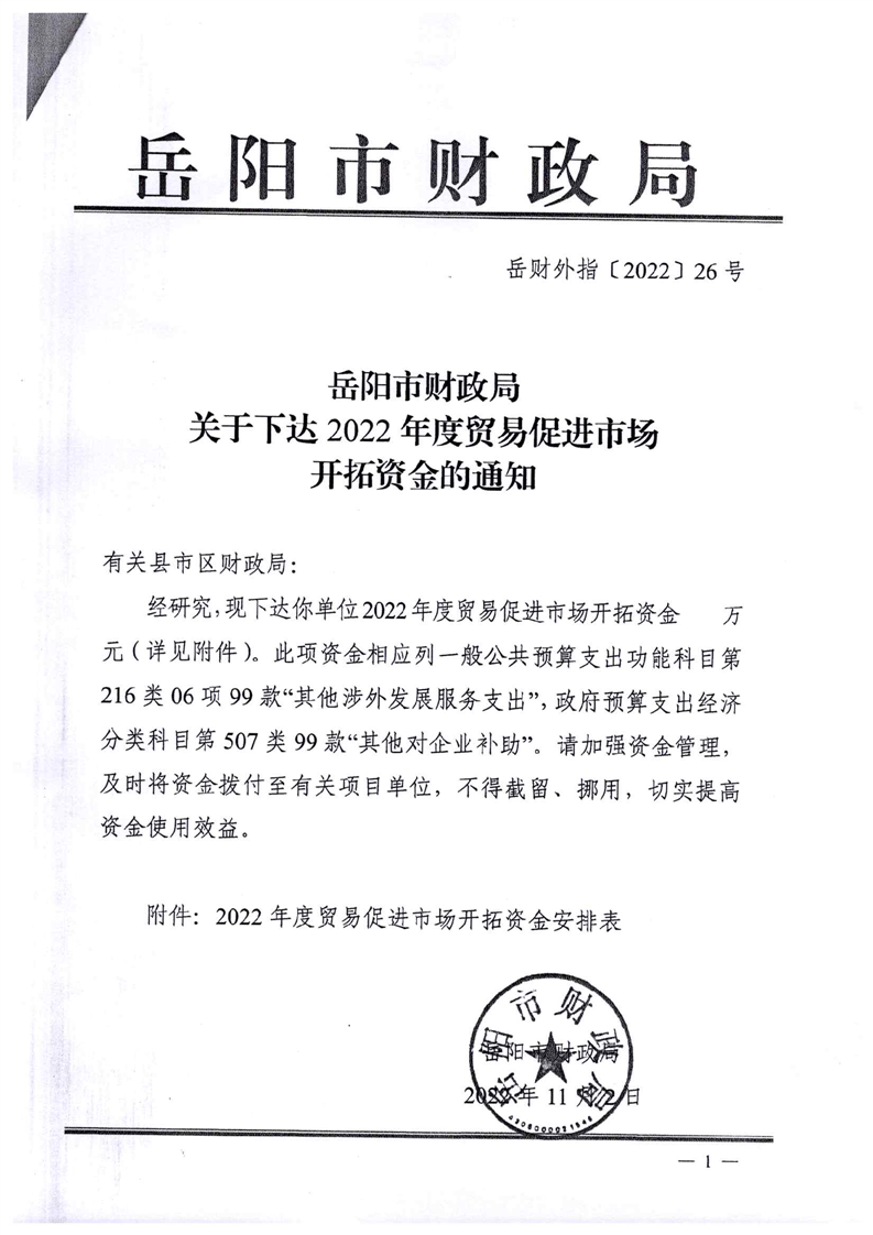 岳陽市財(cái)政局關(guān)于下達(dá)2022年度貿(mào)易促進(jìn)市場開拓資金的通知