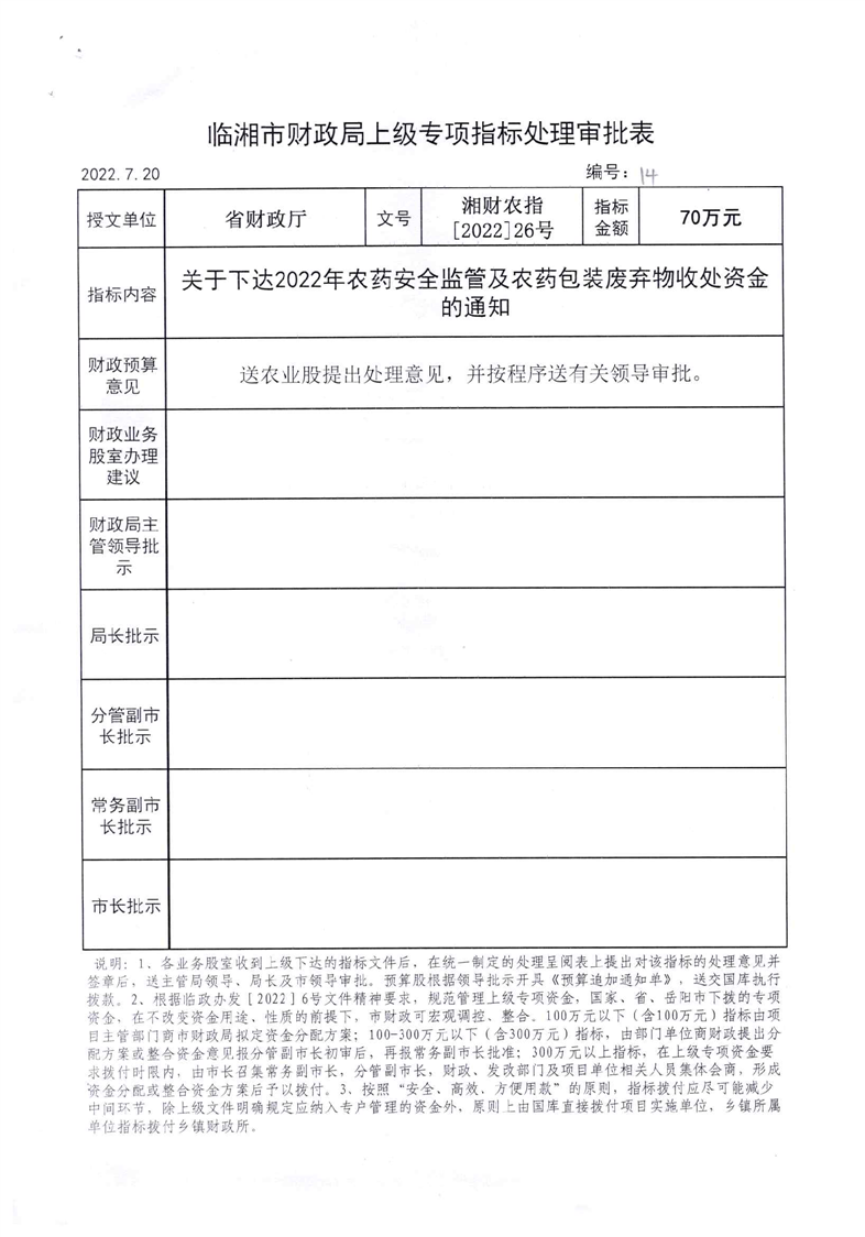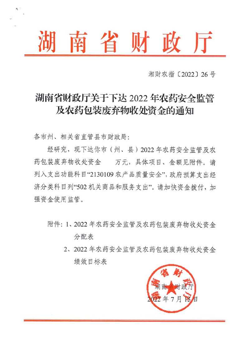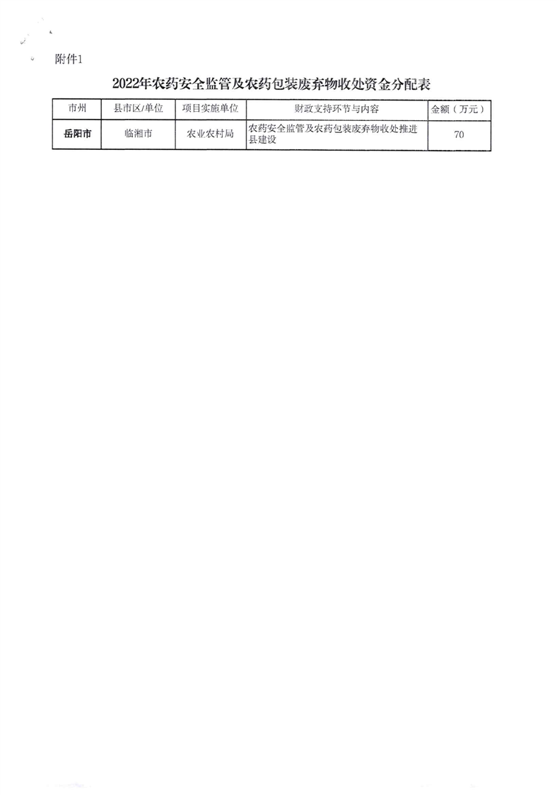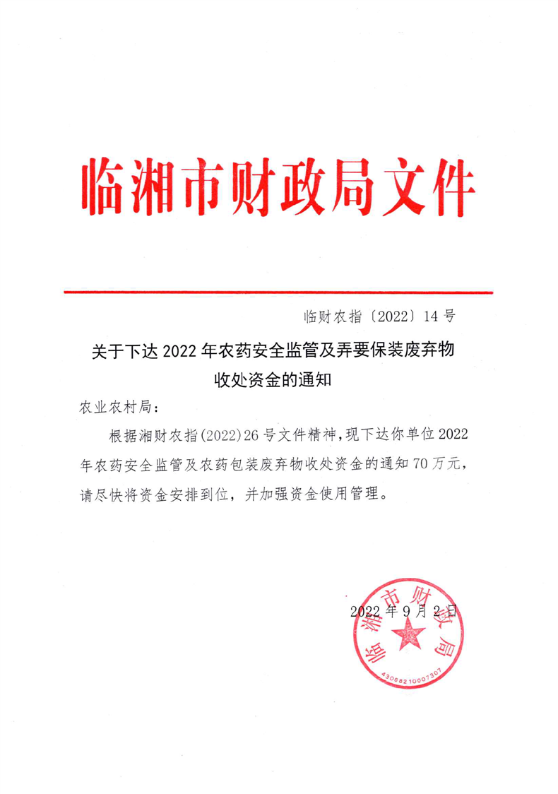 關于下達2022年農藥安全監管及農藥保裝廢棄物收處資金的通知