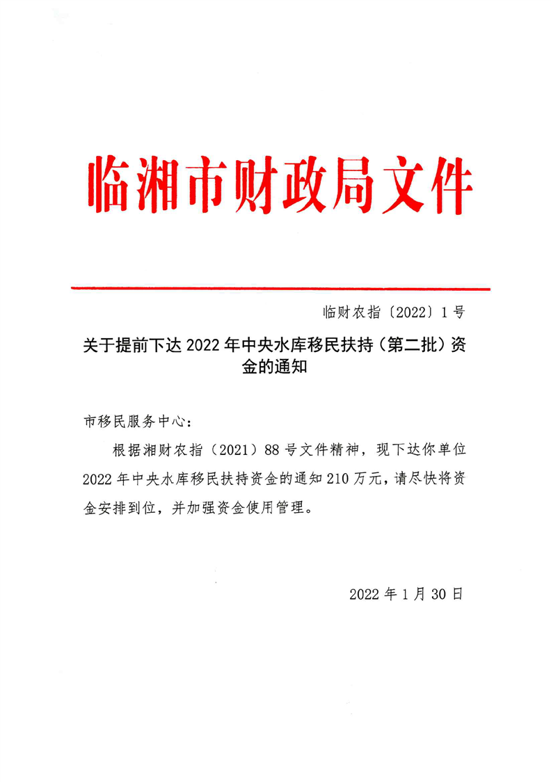 關于提前下達2022年中央水庫移民扶持(第二批)資金的通知