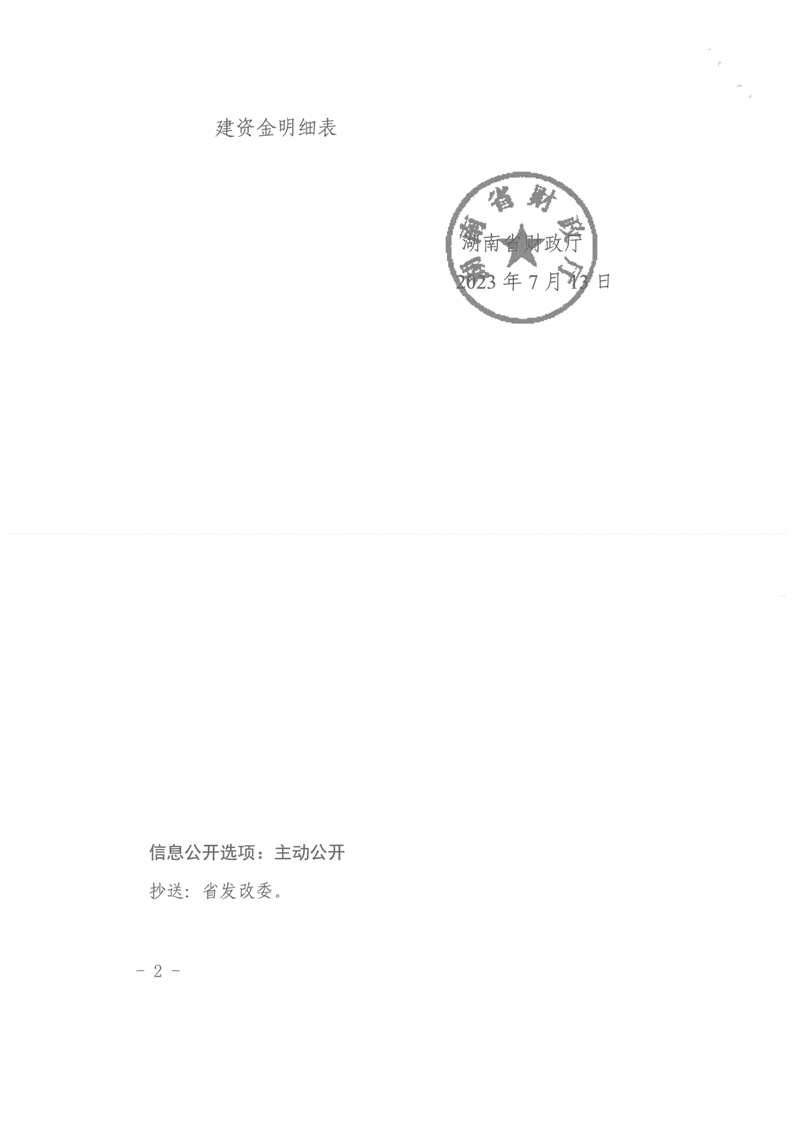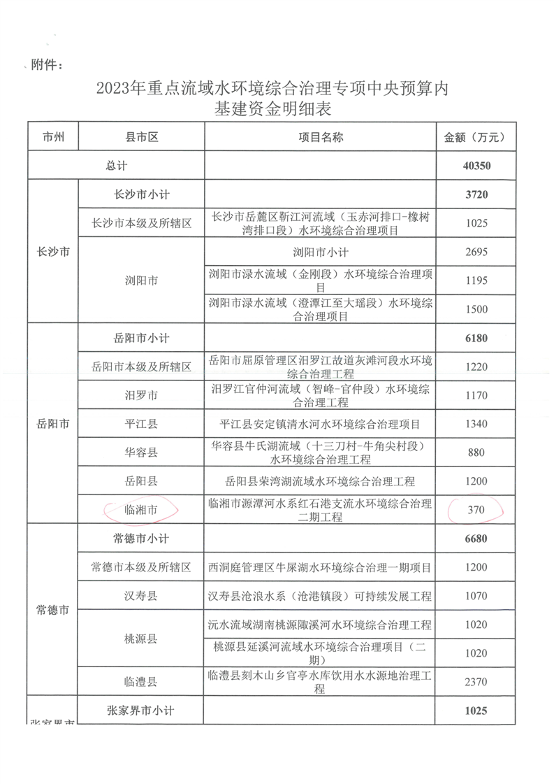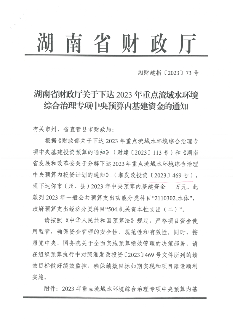 湖南省財政廳關于下達2023年重點流域水環境綜合治理專項中央預算內基建資金的通知(湘財建指〔2023〕73號)