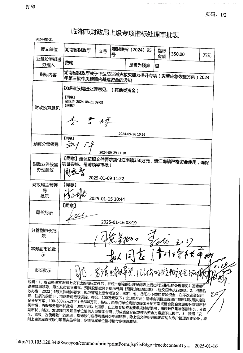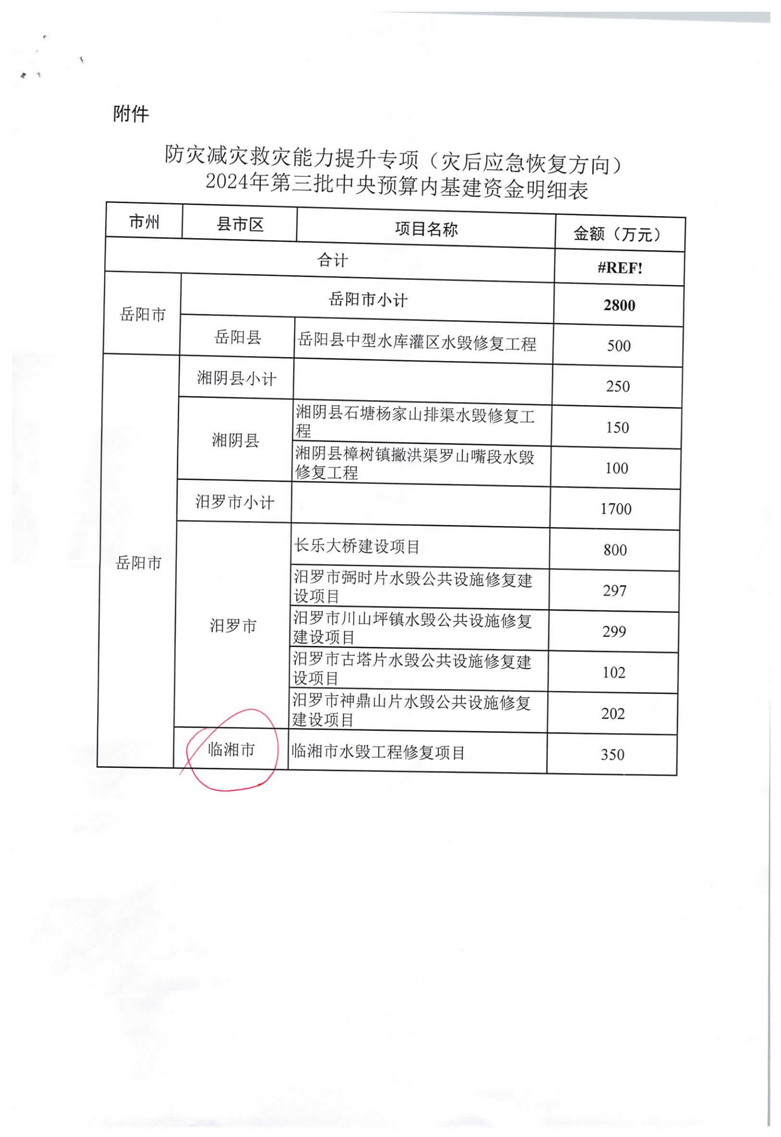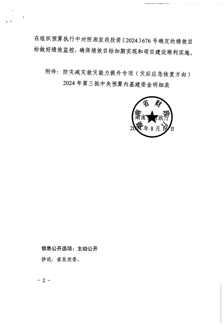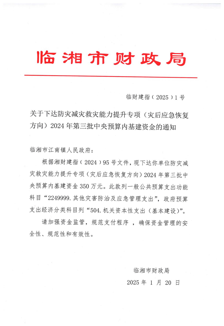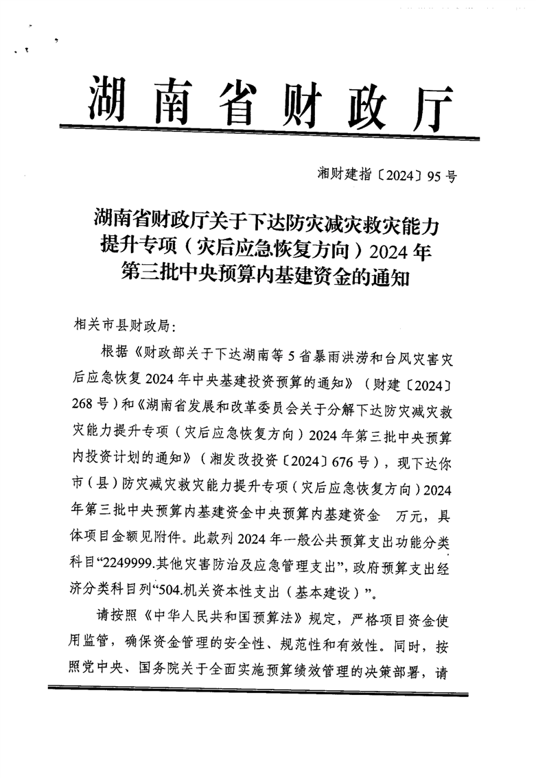 關于下達防災減災救災能力提升專項(災后應急恢復方向)2024年第三批中央預算內基建資金的通知