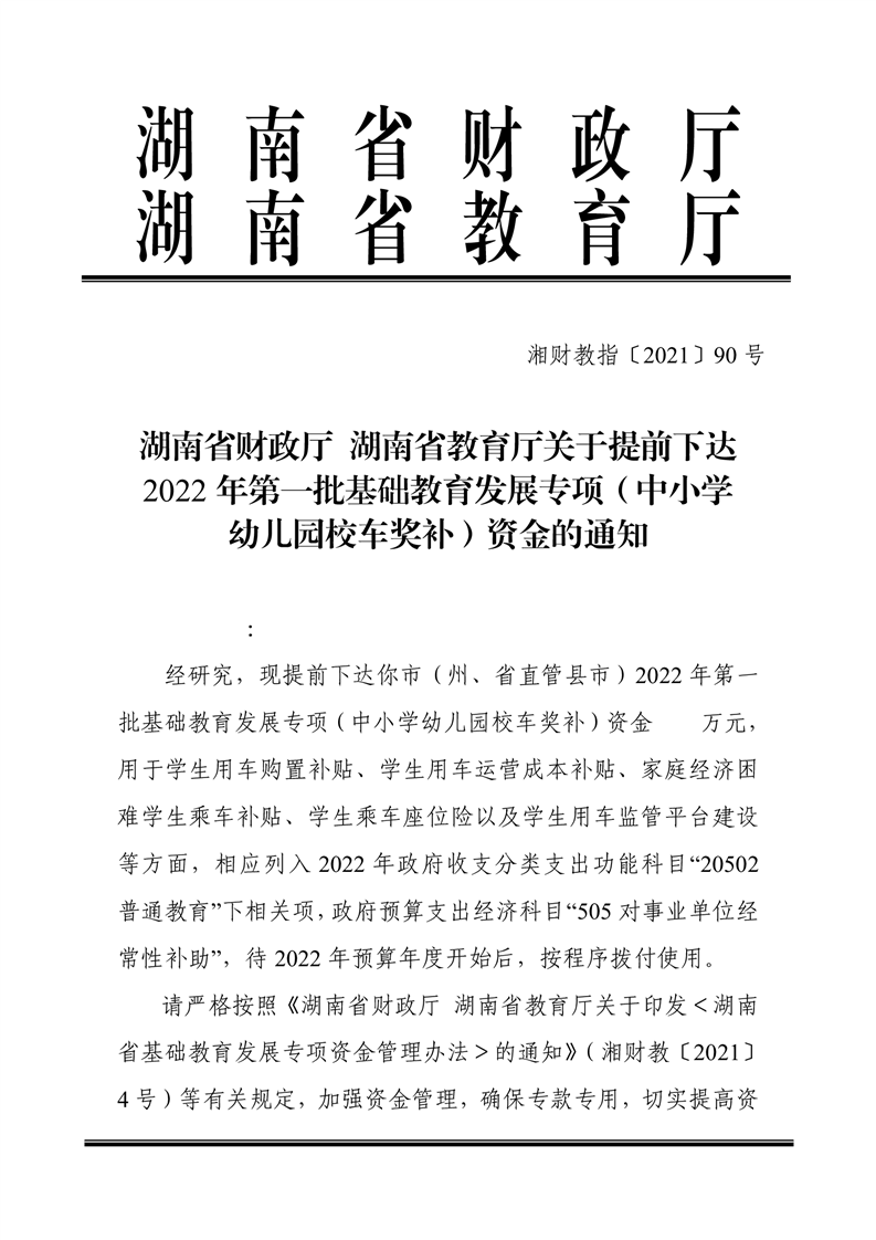 關于提前下達2022年第一批基礎教育發展患者(中小學幼兒園校車獎補)資金的通知