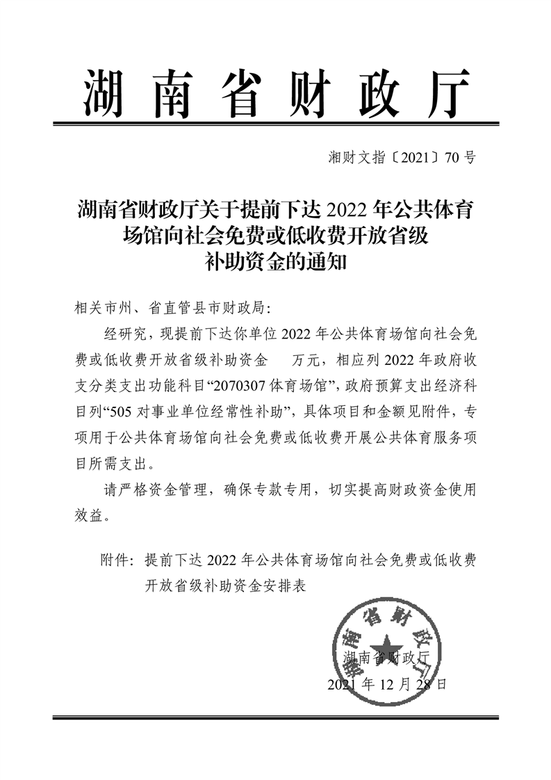 關于提前下達2022年公共體育場館向社會免費或低費開放省級補助資金的通知