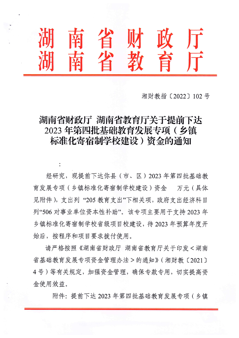 關于提前下達2023年第四批基礎教育發展專項(鄉鎮標準化寄宿制學校建設)資金的通知