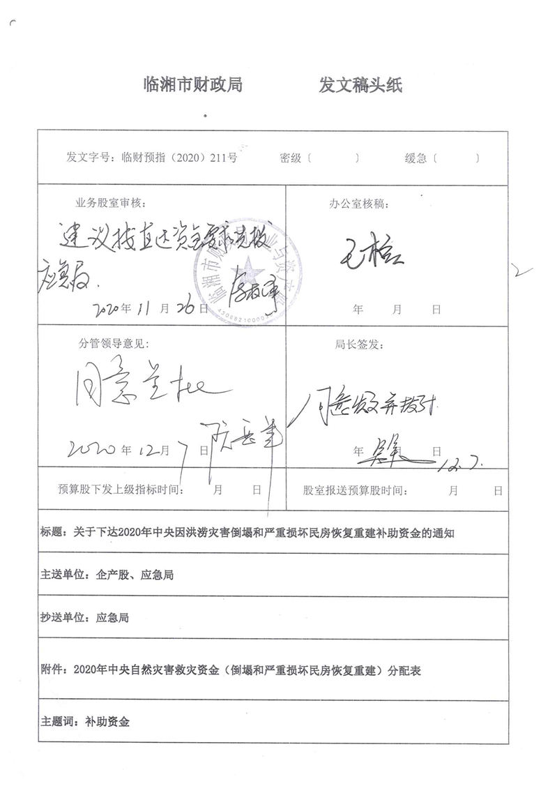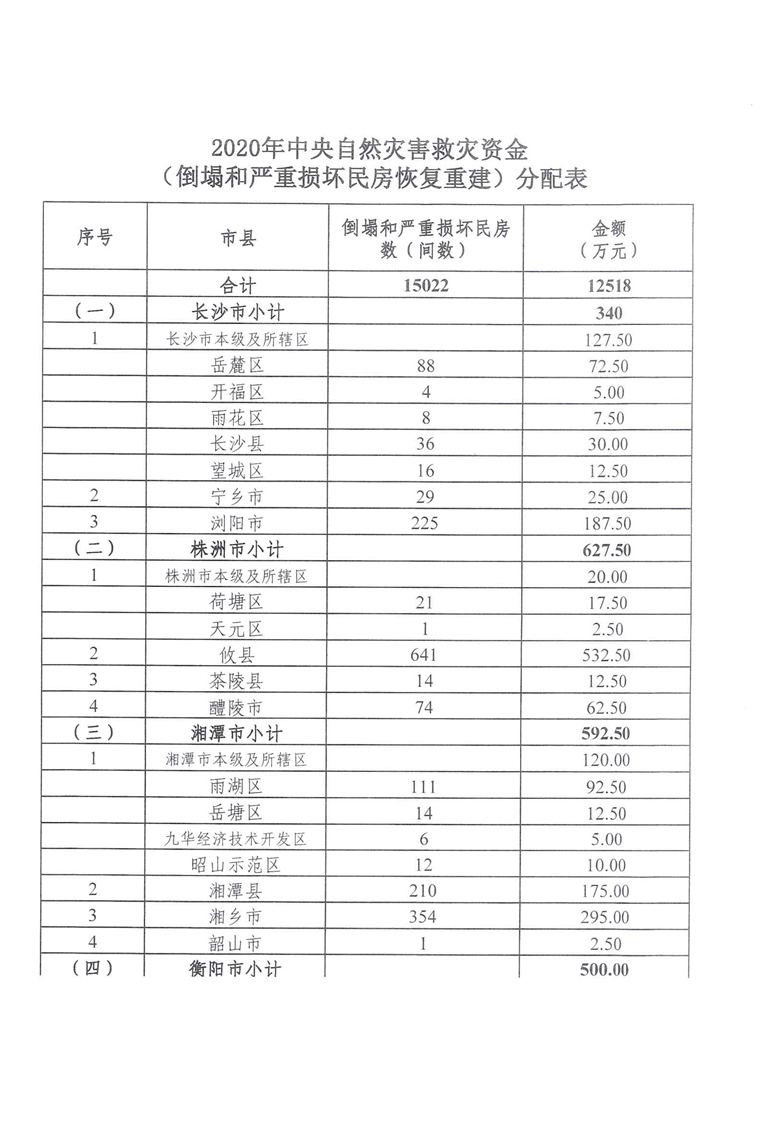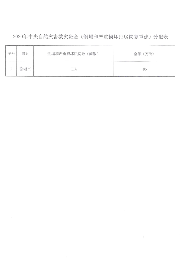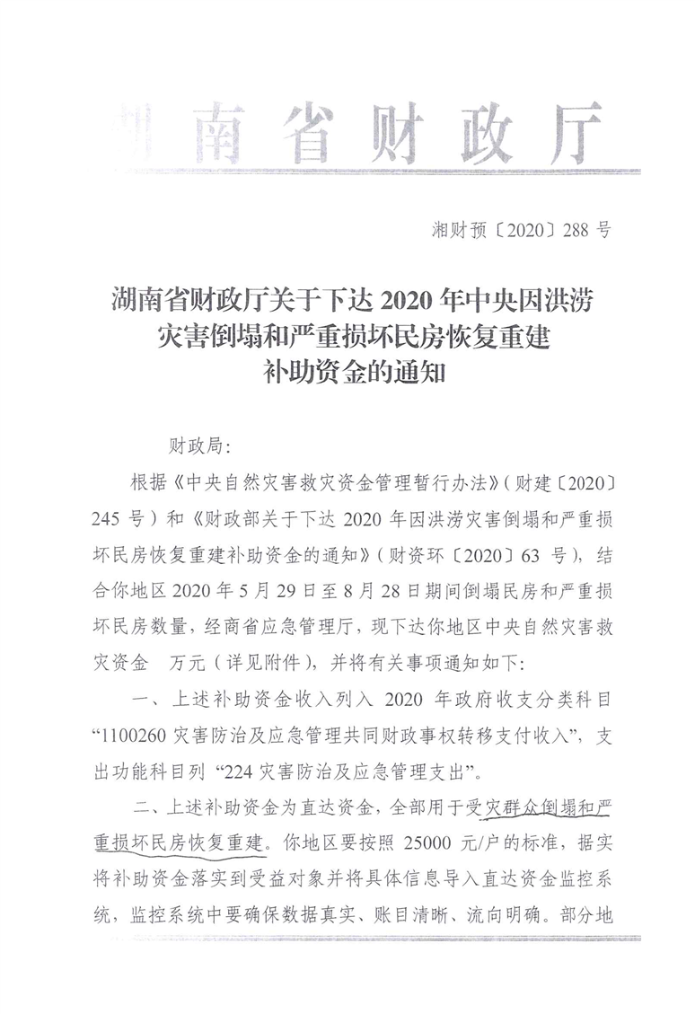 湖南省財(cái)政廳關(guān)于下達(dá)2020年中央因洪澇災(zāi)害倒塌和嚴(yán)重?fù)p壞民房恢復(fù)重建補(bǔ)助資金的通知