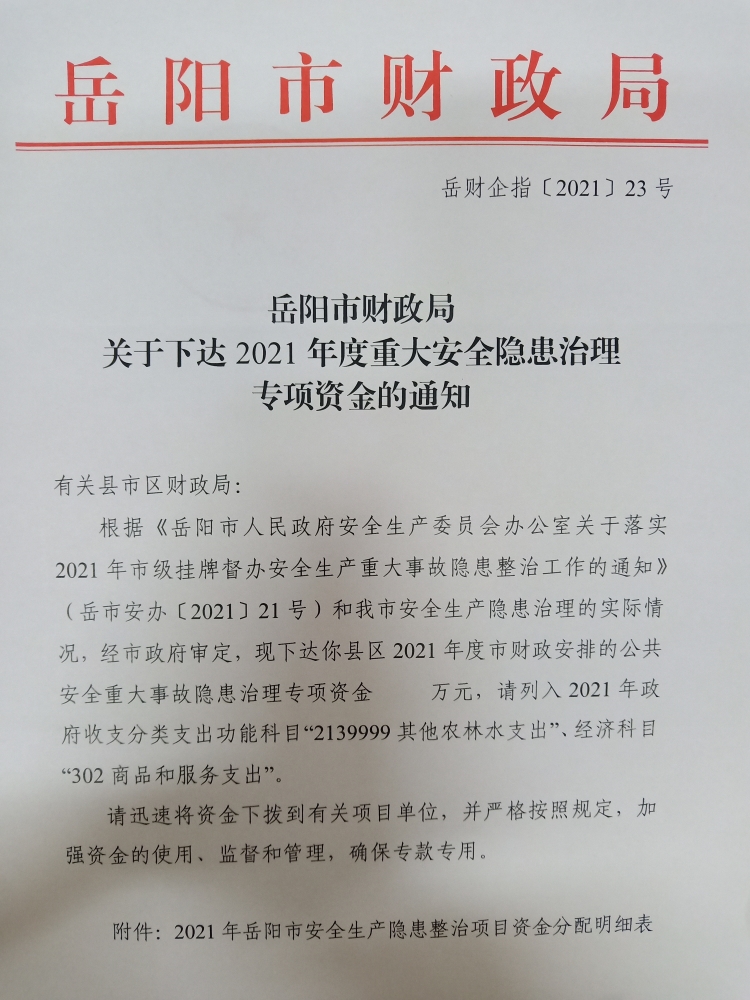 岳陽市財政局關于下達2021年度重大安全隱患治理專項資金的通知