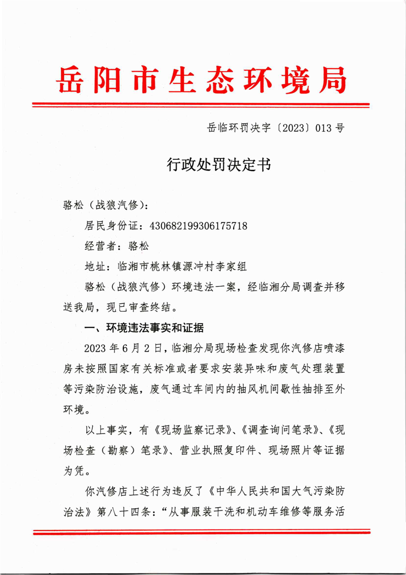 岳臨環罰決字[2023]013號