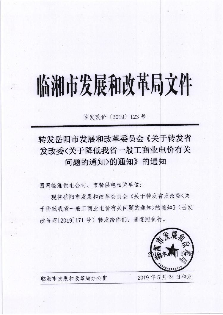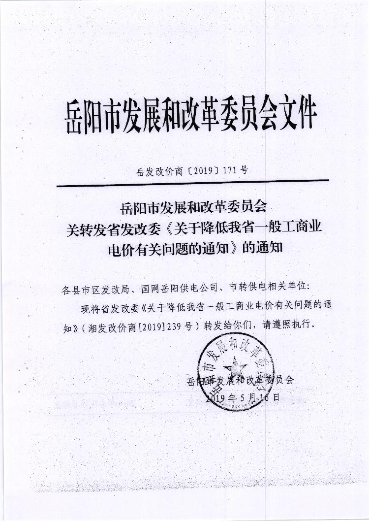 轉(zhuǎn)發(fā)岳陽市發(fā)展和改革委員會《關(guān)于轉(zhuǎn)發(fā)省發(fā)改委關(guān)于降低我省一般工商業(yè)電價有關(guān)問題的通知的通知》的通知