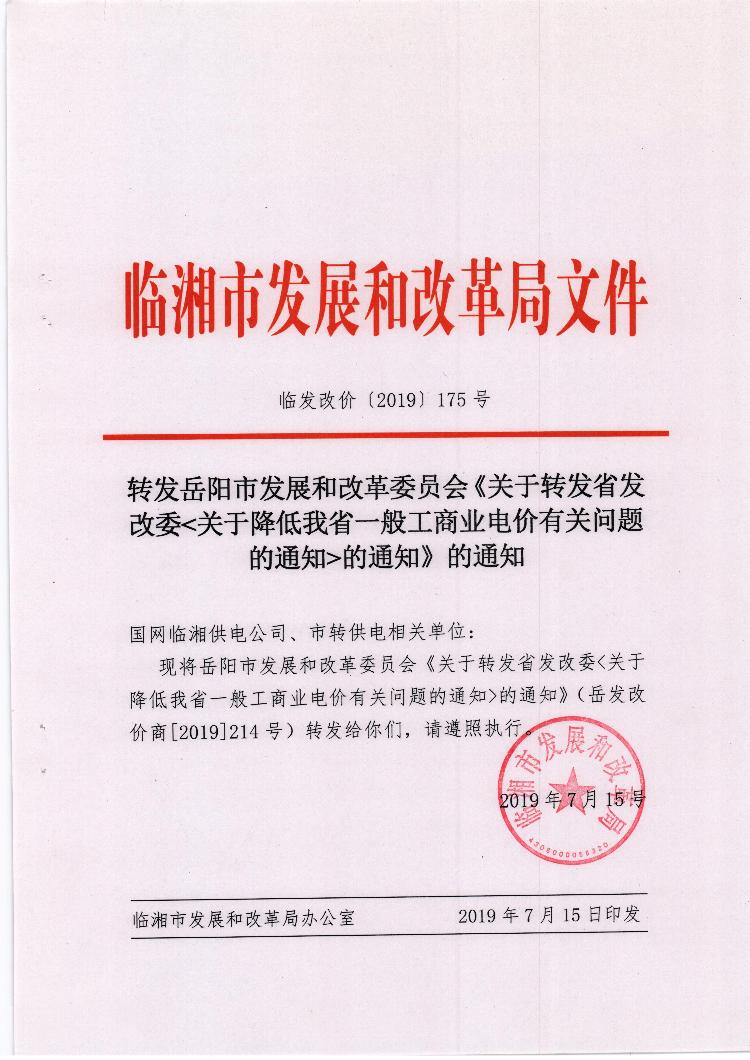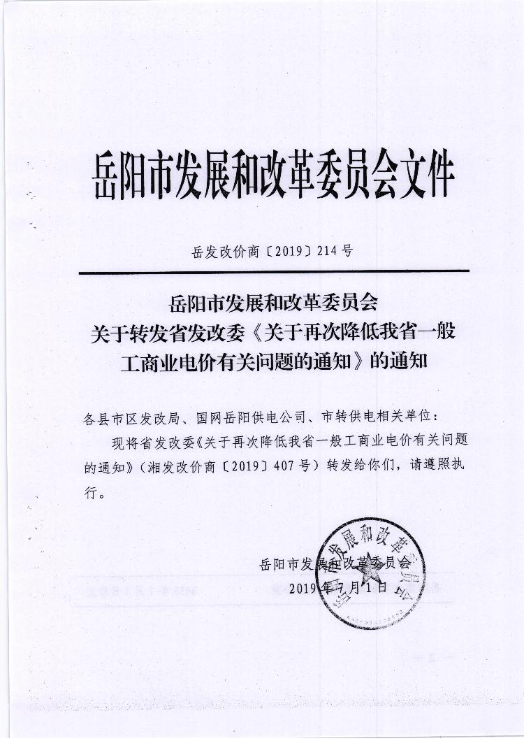 關于轉發岳陽市發展和改革委員會《關于轉發省發改委 關于降低我省一般工商業電價有關問題的通知 的通知》的通知