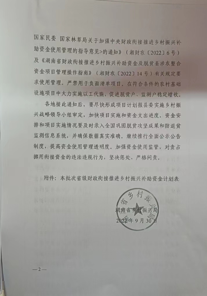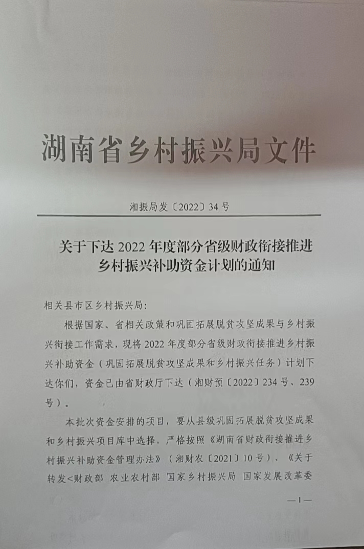 關于下達2022年市級財政銜接推進鄉村振興補助資金的通知(湘財預[2022]239號)