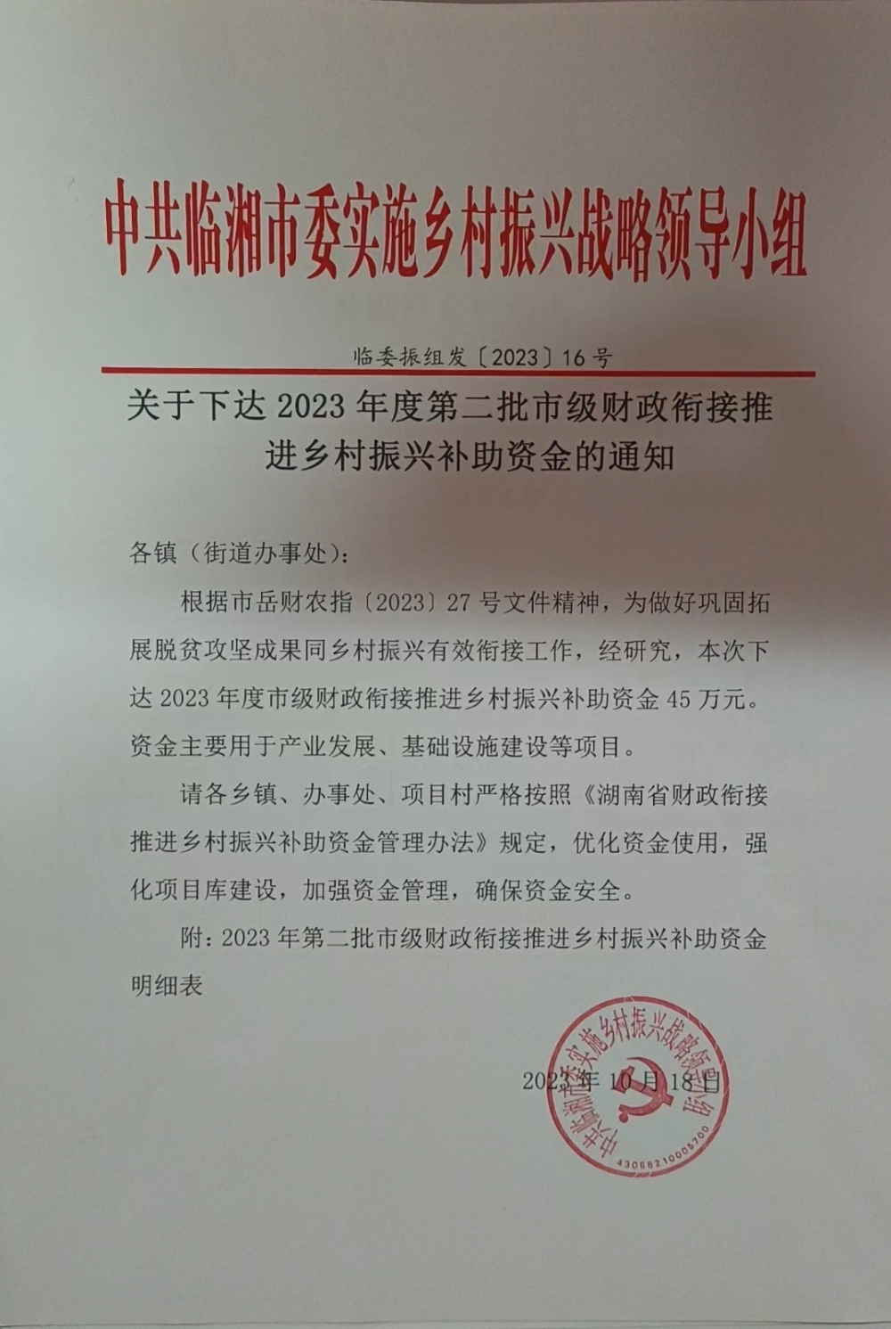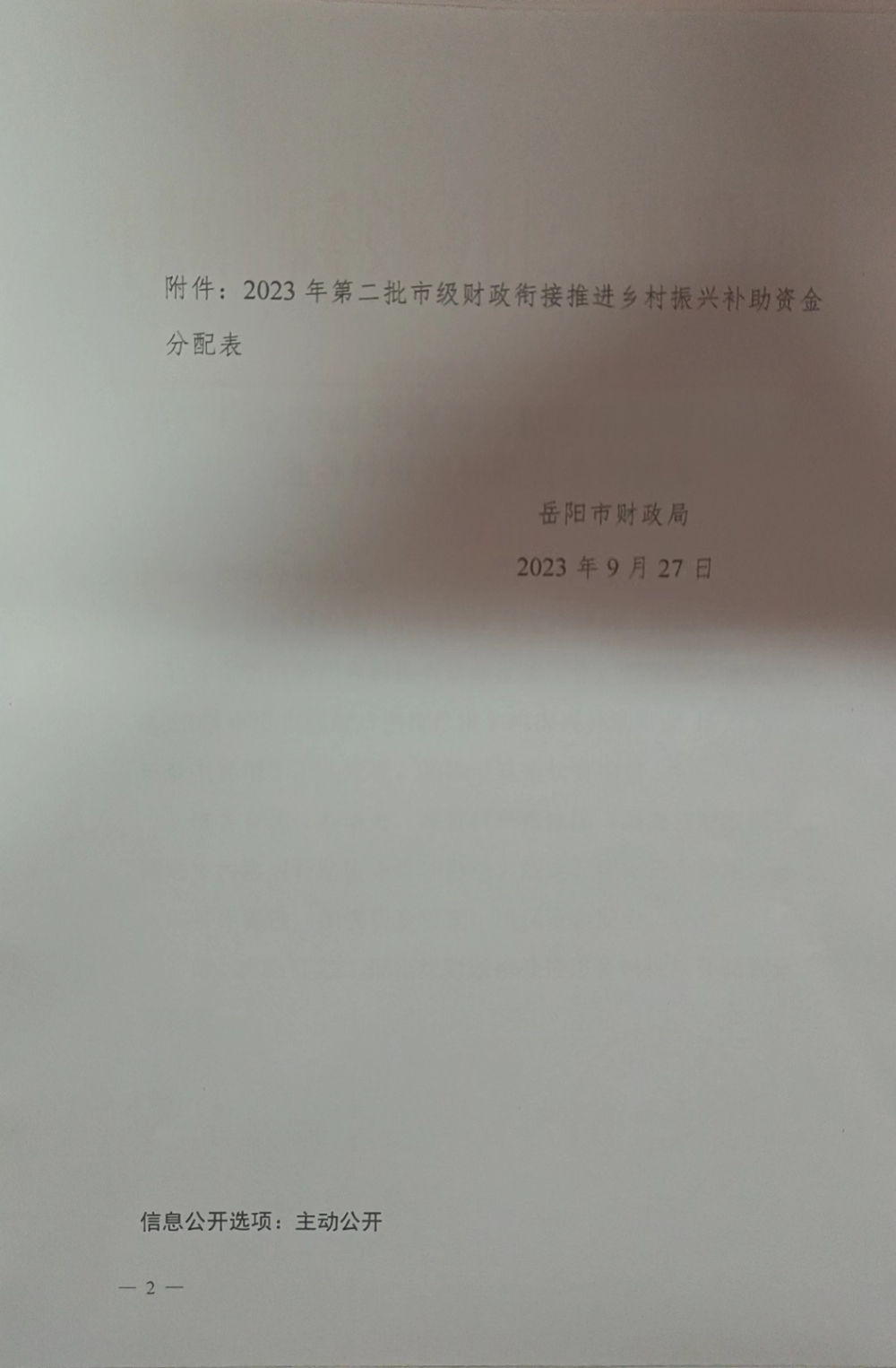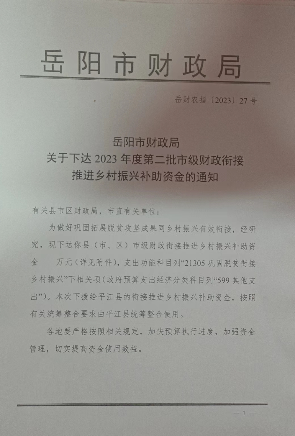 關于下達2023年度第二批市級財政銜接推進鄉村振興補助資金的通知(岳財農指[2023]27號)