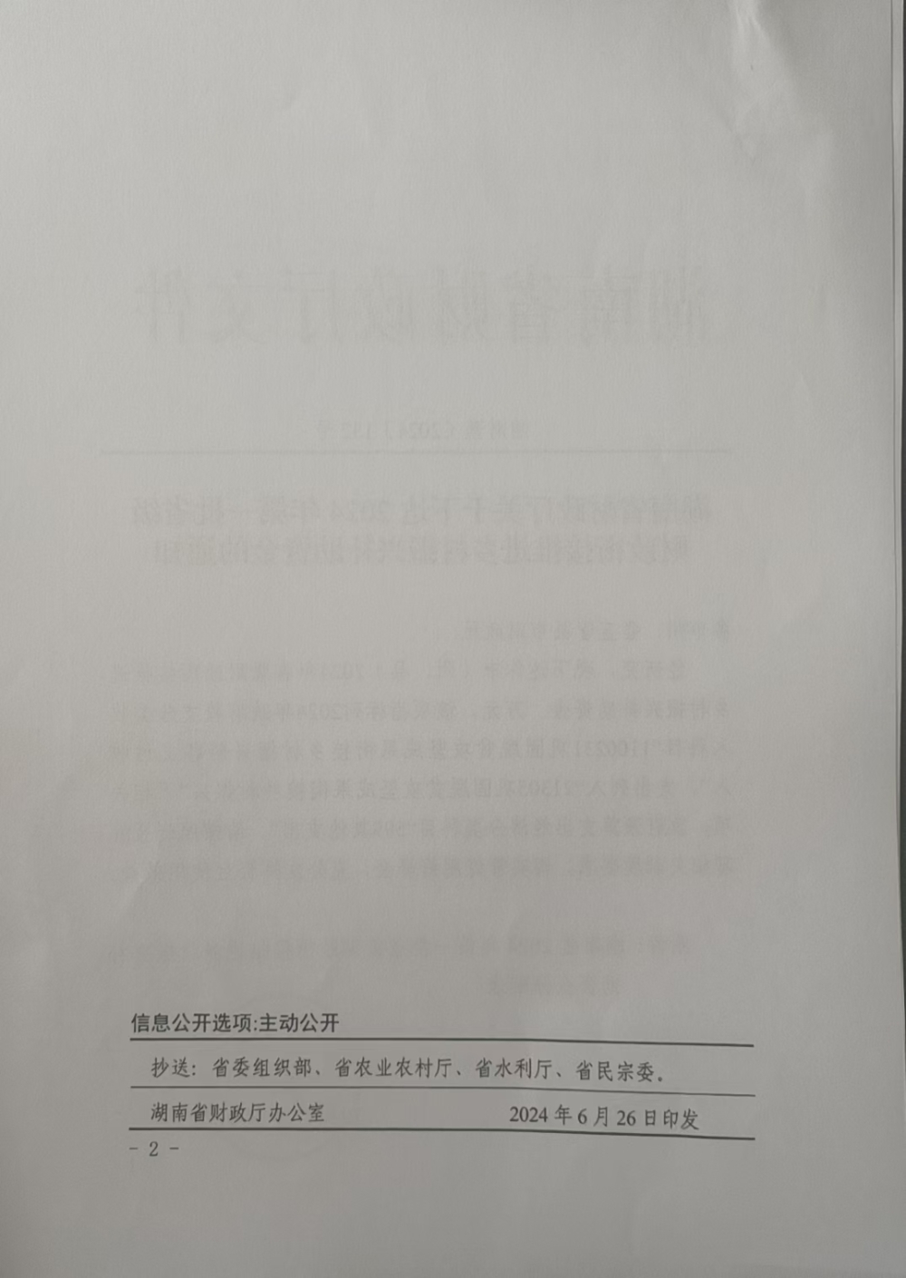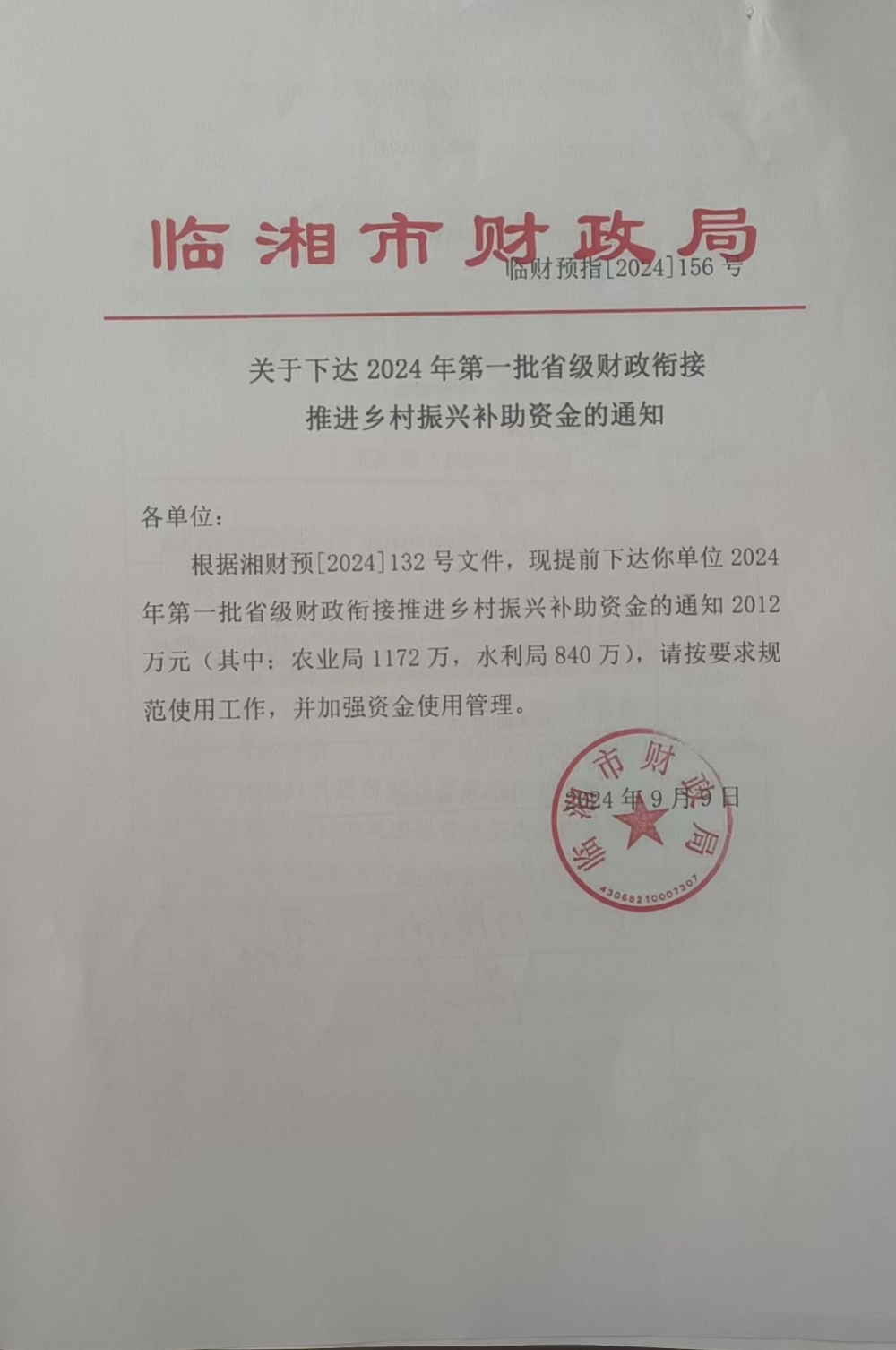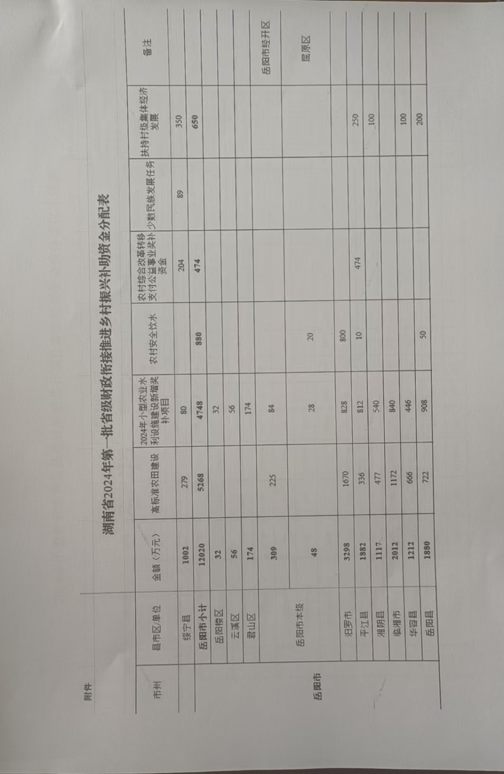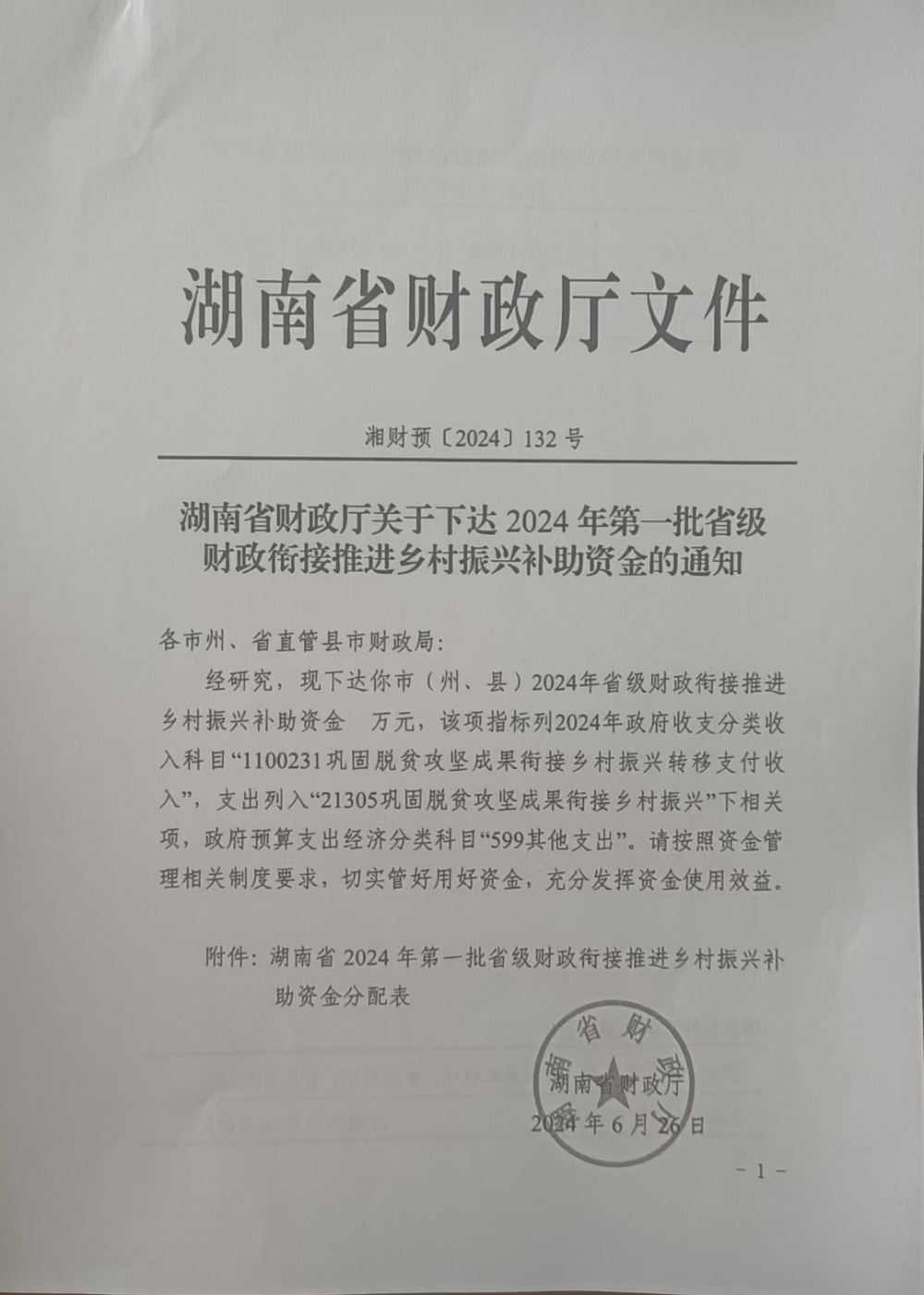 關于下達2024年第一批省級財政銜接推進鄉村振興補助資金的通知(湘財預[2024]132號)