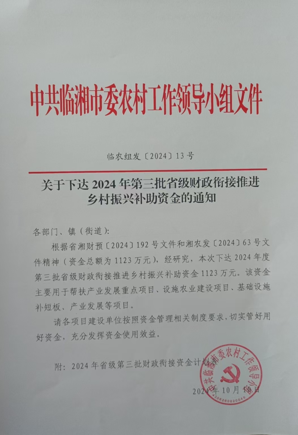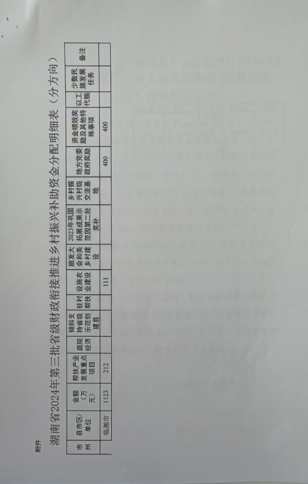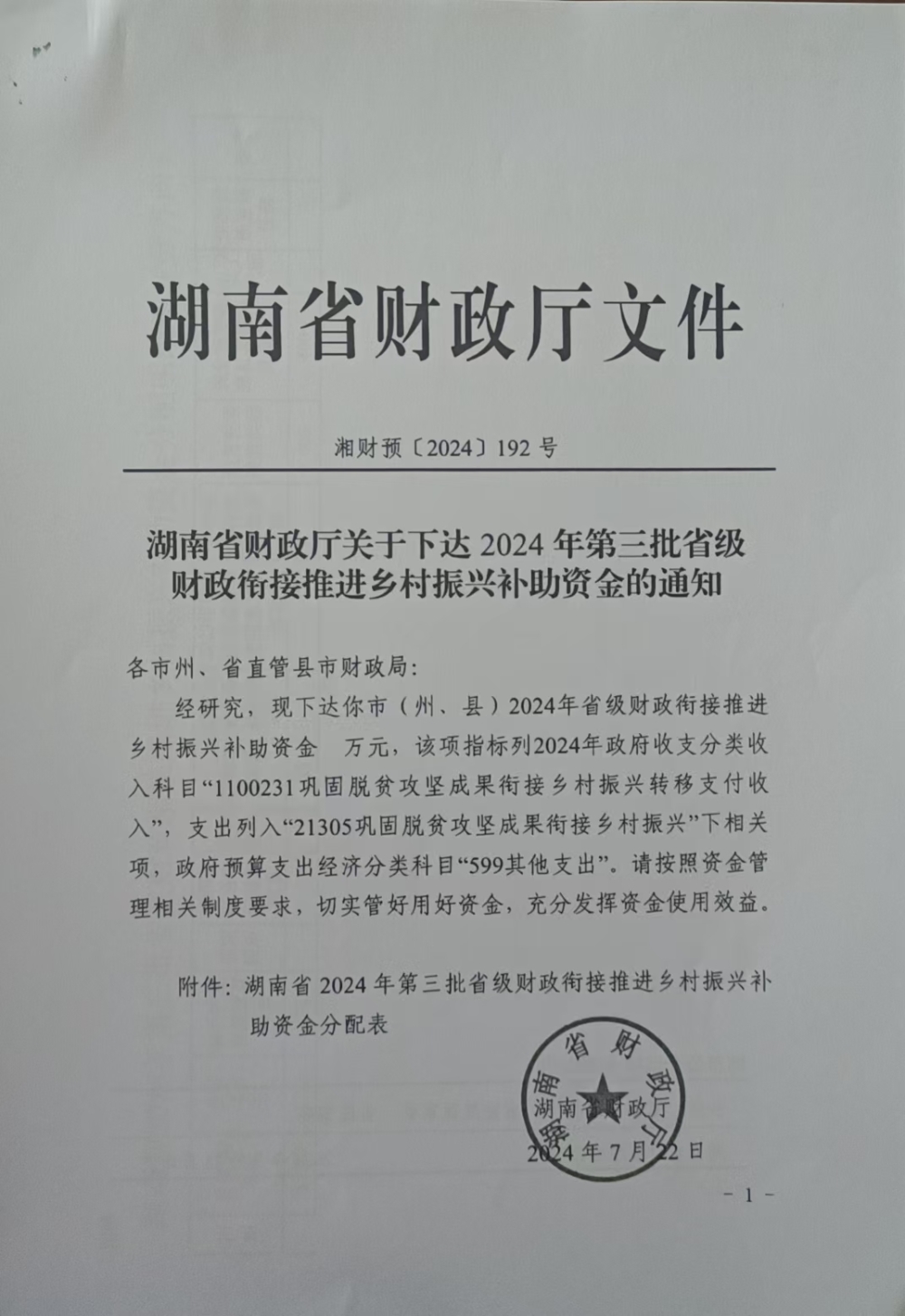 關于下達2024年第三批省級財政銜接推進鄉村振興補助資金的通知(湘財預[2024]192號)