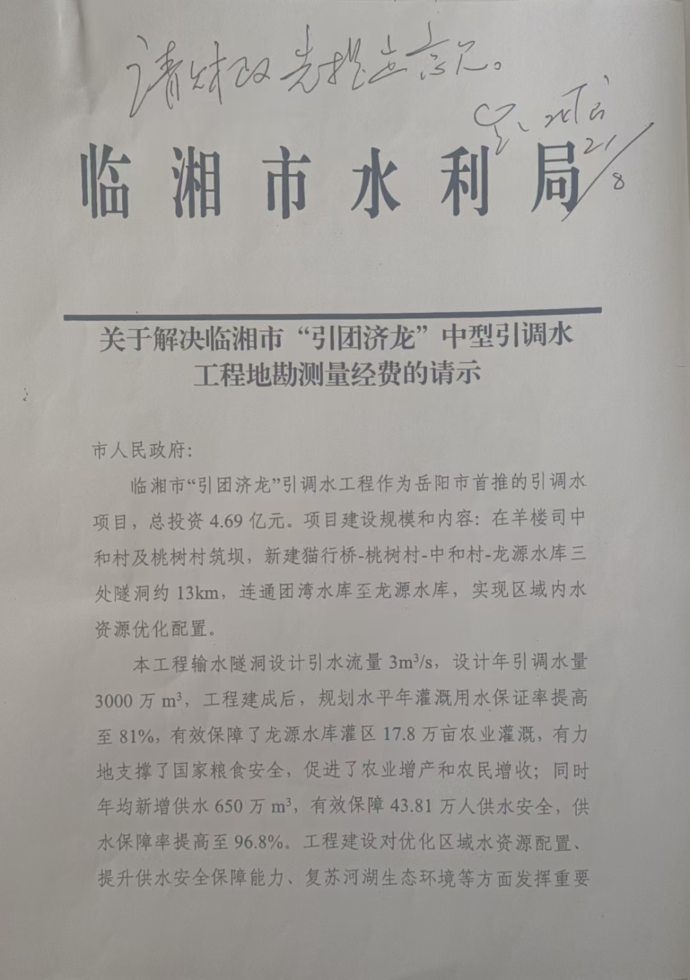 關于解決臨湘市“引團濟龍”中型引調水工程地勘測量經費的報告(縣級配套6)