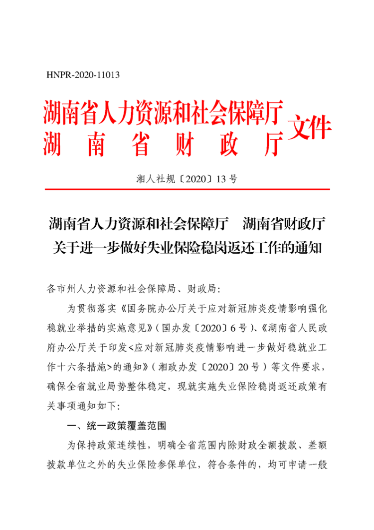關于進一步做好失業保險穩崗返還工作的通知(湘人社規[2020]13號)