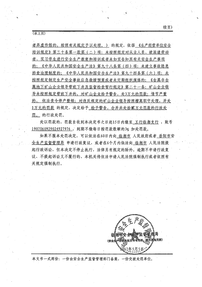 對岳陽市富安礦業(yè)有限公司的行政處罰決定書