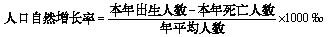 人口自然增長率 指在一定時期內(通常為一年)人口自然增加數(出生人數減死亡人數)與該時期內平均人數(或期中人數)之比,用千分率表示。計算公式為: