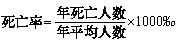 死亡率(又稱粗死亡率) 指在一定時期內(通常為一年)一定地區的死亡人數與同期內平均人數(或期中人數)之比,用千分率表示。本資料中的死亡率指年死亡率,其計算公式為: