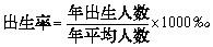 式中:出生人數指活產嬰兒,即胎兒脫離母體時(不管懷孕月數),有過呼吸或其他生命現象。年平均人數指年初、年底人口數的平均數,也可用年中人口數代替。