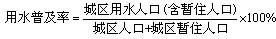 用水普及率 指報(bào)告期末城區(qū)用水人口數(shù)與城市人口總數(shù)的比率。計(jì)算公式: