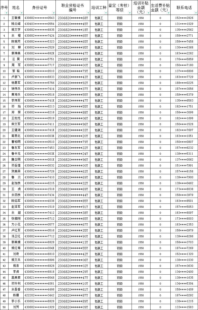 職業(yè)技能培訓補貼人員名冊(欣浩 、第一期包裝工)