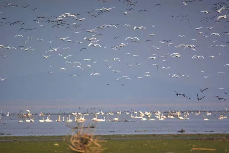 ▲近年來,隨著黃蓋湖水環境的不斷改善,每年在黃蓋湖越冬的小天鵝、雁類、野鴨等候鳥數量達2萬余只,越冬候鳥總數同比持續增長,一湖碧水、群鳥齊飛的景象在黃蓋湖再現