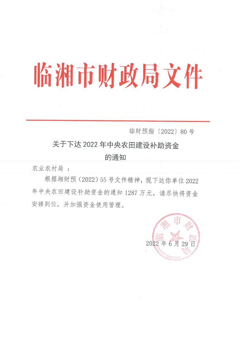 2022年6月29日關于下達中央農田建設補助資金的通知