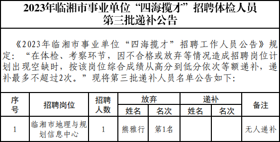 2023年臨湘市事業單位“四海攬才”招聘體檢人員第三批遞補公告