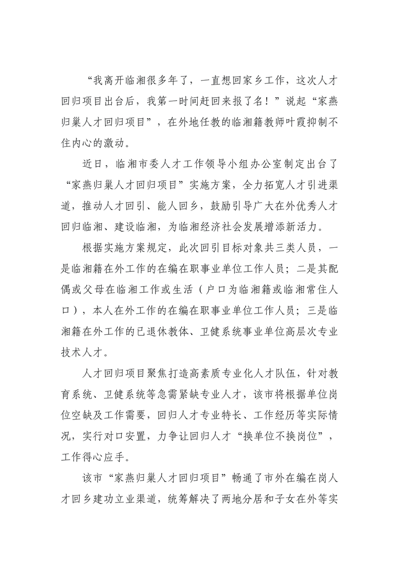 臨湘:啟動“家燕歸巢人才回歸項目”,助推人才反哺家鄉(xiāng)