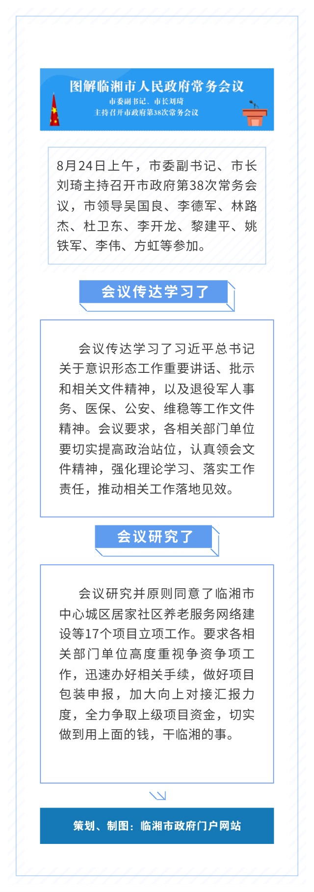 8月24日上午,市委副書記、市長劉琦主持召開市政府第38次常務會議,市領導吳國良、李德軍、林路杰、杜衛東、李開龍、黎建平、姚鐵軍、李偉、方虹等參加。
