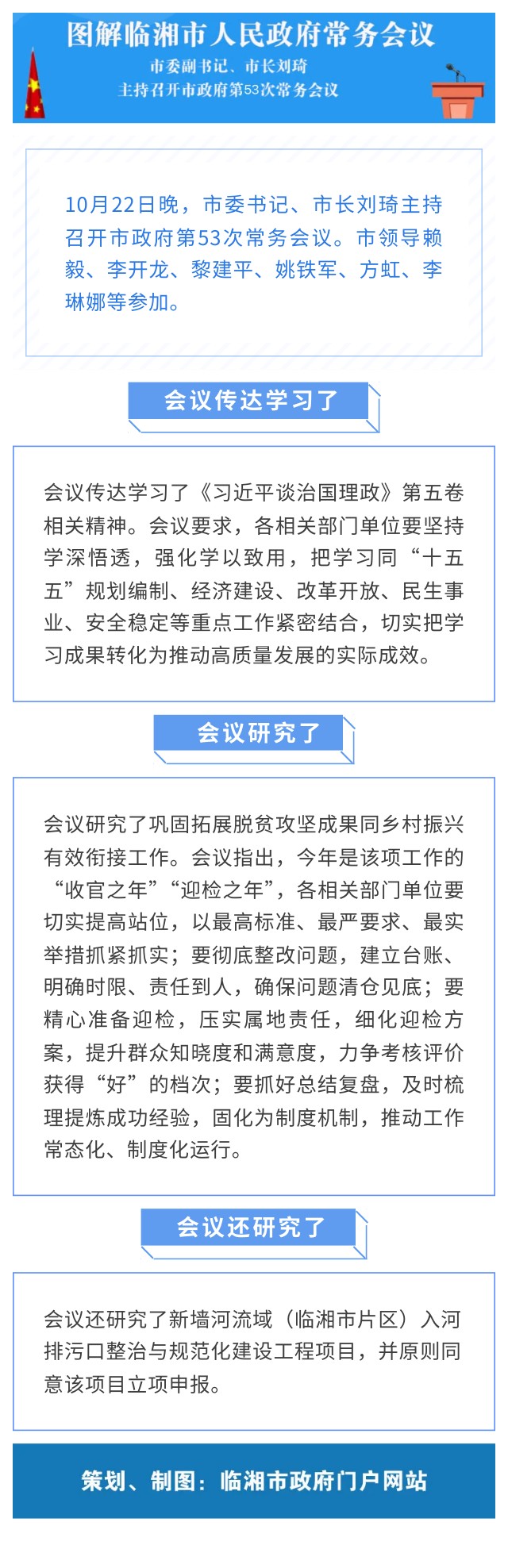 10月22日晚,市委書記、市長劉琦主持召開市政府第53次常務會議。市領導賴毅、李開龍、黎建平、姚鐵軍、方虹、李琳娜等參加。