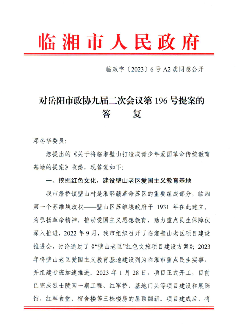 對岳陽市政協九屆二次會議第196號提案的答復